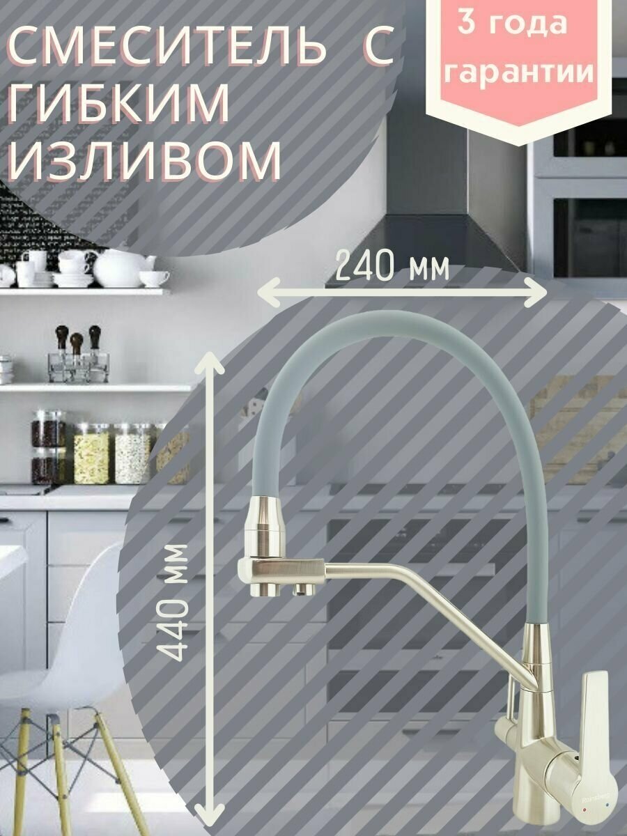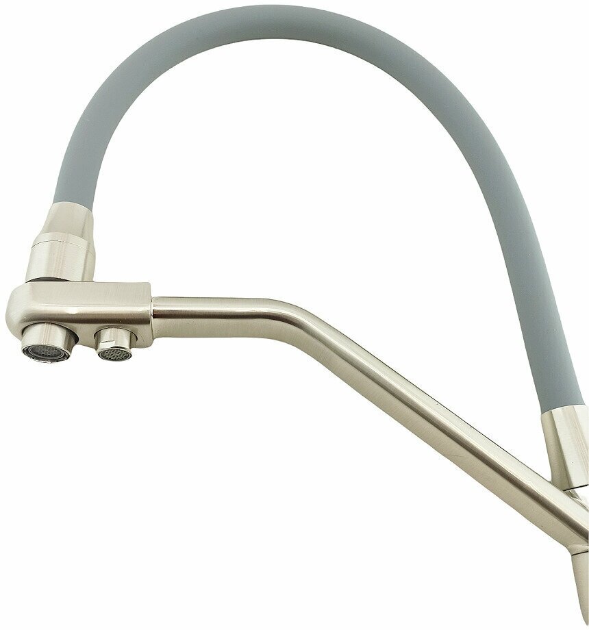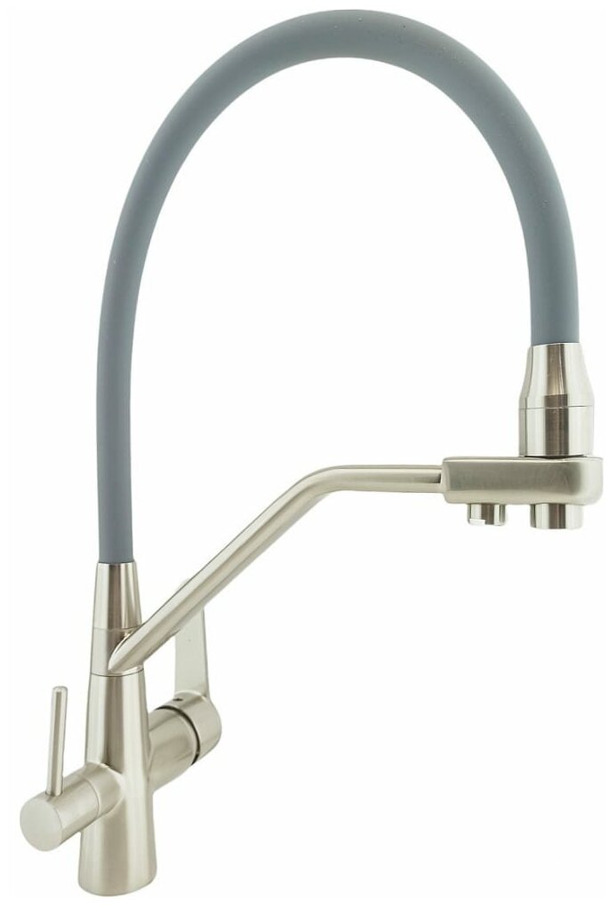 Смеситель для кухни Rainsberg корпус цвета сатин с гибким серым изливом, однорычажный, с отдельным выходом под фильтр. Цвет: сатин с серым изливом
