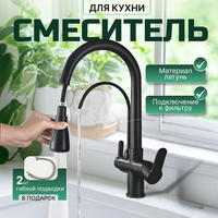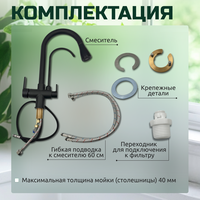 | Комплектация | смеситель, крепежные детали, гибкая подводка к смесителю 60 см. переходник для переключения к фильтру |