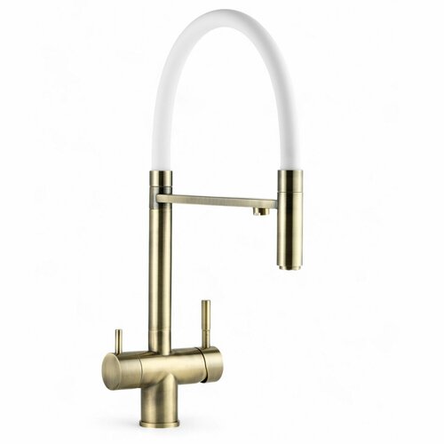 Смеситель для кухни с фильтром для питьевой воды бронзовый с гибким силиконовым гусаком белого цвета - это высокое качество по доступной цене. • Материал корпуса изготовлен из высококачественной латуни, стойкой к коррозии, резким изменениям давления и перепадам температуры воды.• Белый гибкий силиконовый гусак фиксируется на изливе для воды из фильтра, при снятии позволяет дотянуться на любого угла мойки, незаменим при мытье крупногабаритной посуды и самой мойки.• Аэратор смесителя позволяет экономить воду, насыщая струю воздухом. • Встроенный отдельный канал для фильтрованной воды позволяет, при подключении к любому фильтру, наслаждаться чистой питьевой водой прямо из смесителя. Нет необходимости устанавливать отдельный кран.• Плавный ход ручки, точность регулировки температуры и напора воды достигается установленным качественным керамическом картриджем 35 мм. • Актуальный хай-тек дизайн смесителя сделает вашу кухню современной и будет радовать долго время. В комплекте поставляется: смеситель, система крепления с прокладками, подводка к смесителю и крану для фильтра.Габаритные размеры: высота 500 мм, ширина 150 мм, длина 260 мм, картридж 35 мм, общая длина гибкого гусака 590 мм, вылет гусака 230 мм, высота от столешницы до носика 210 мм, диаметр основания 45 мм, высота крепления 70 мм, диаметр крепления 32 мм, длина подводки 60 см. Длина ручки смесителя 10 см, диаметр ручки 43 мм, длина аэратора 110 мм, диаметр аэратора 23 мм.