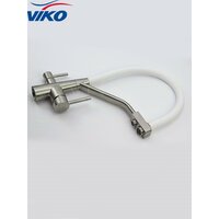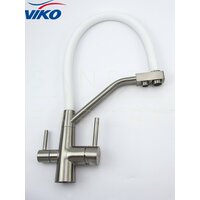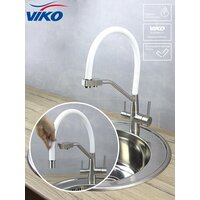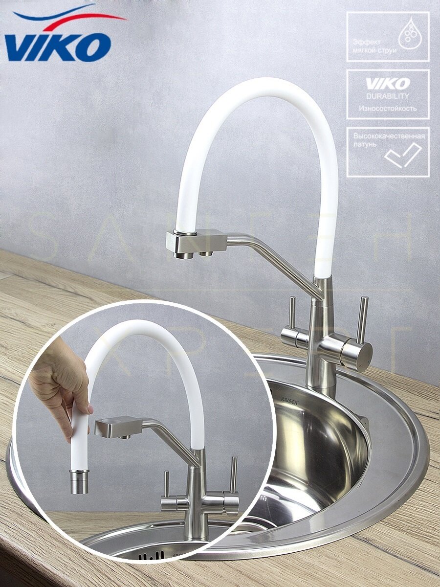 Компания VIKO предлагает вам линейку однорычажных кухонных смесителей с гибким съёмным изливом и подключением к фильтру для кухни, мойки, ванной, умывальника и бани которые соответствуют всем требованиям современных потребителей. Смеситель для кухни VIKO с переключателем на фильтр оснащен тремя подключениями. Один к фильтру, два к водопроводу. Особенность данной модели это съёмный гнущийся излив во все стороны. Излив у таких смесителей сконструирован по принципу двух трубок одна для фильтра вторая для смешанной воды. По жесткой фиксированной трубке идёт отфильтрованная вода, по съёмной силиконовой водопроводная. Это позволяет сэкономить место на кухне и избавляет от необходимости устанавливать дополнительный кран для фильтра. У смесителя с переключателем на фильтр два рычага - один открывает подачу водопроводной воды, второй - фильтрованной. Люди которые привыкли к бутилированной воде, очень быстро переключаются на смеситель с подключением к фильтру. В отличие от бутилированной воды, фильтр под мойкой выдает воду в почти неограниченном количестве. Фильтрующие элементы нужно периодически менять. Качество воды в кране полностью зависит от системы фильтров под мойкой. Качественный сплав обеспечивает максимальную прочность изделия. Устойчив к воздействию тепла и влаги благодаря латунному корпусу и хромированному покрытию, которое легко моется, не ржавеет, не покроется пятнами, не подвергается коррозии. Никель-хромовое покрытие защищает смеситель и душевые аксессуары VIKO от образования трещин и сколов, продлевая срок их службы. Корпус умывальника изготовлен из сплава с высоким содержанием латуни покрытый качественной краской. Присутствуют вставки из разноцветного силикона в изливе. Сантехника VIKO отвечает современным стандартам, отличается приятной эргономичностью в сочетании с интересным дизайном и привлекательной ценой. Надежное покрытие обеспечивает долгую механическую износостойкость деталям. Латунь высокой прочности. Смеситель не изменит свой цвет и не покроется пятнами в течение многих лет. Керамический картридж позволяют без лишних усилий настроить подходящую температуру воды. Удобные однозахватная ручка позволет легко регулировать температуру и напор воды даже мыльной рукой. Уход за смесителем VIKO прост и не требует специальных чистящих средств. Сменный откручивающийся взаимозаменяемый аэратор со стандартной резьбой 1/2". У нас Вы найдете современные качественные смесители по самым доступным ценам в России для Вас ! Купив продукцию VIKO Вы будете рекомендовать ее близким и знакомым. Гибкий носик позволяет менять направление струи, благодаря чему можно помыть что-то объёмное. Для равномерного и практически бесшумного потока воды предусмотрен аэратор с функцией легкой очистки. Керамический картридж диаметром 35 мм с повышенным ресурсом переключений. Дизайн крана позволяет установить его также для ванны. В комплекте: Монтажная гайка - 1 шт; Гибкая подводка - 3 шт; Прокладки - 2 шт. Смеситель российской разработки. Смеситель вико для кухни с подключением к фильтру для питьевой воды и гнущимся выдвижным изливом. Стильный гарнитур для вашей кухни или ванны. Для подключения комплектуется качественной подводкой 50 см. Цвета: черный (графит), бежевый, хромированный, золотой, бронза, белый, сатин, коричневый, беже