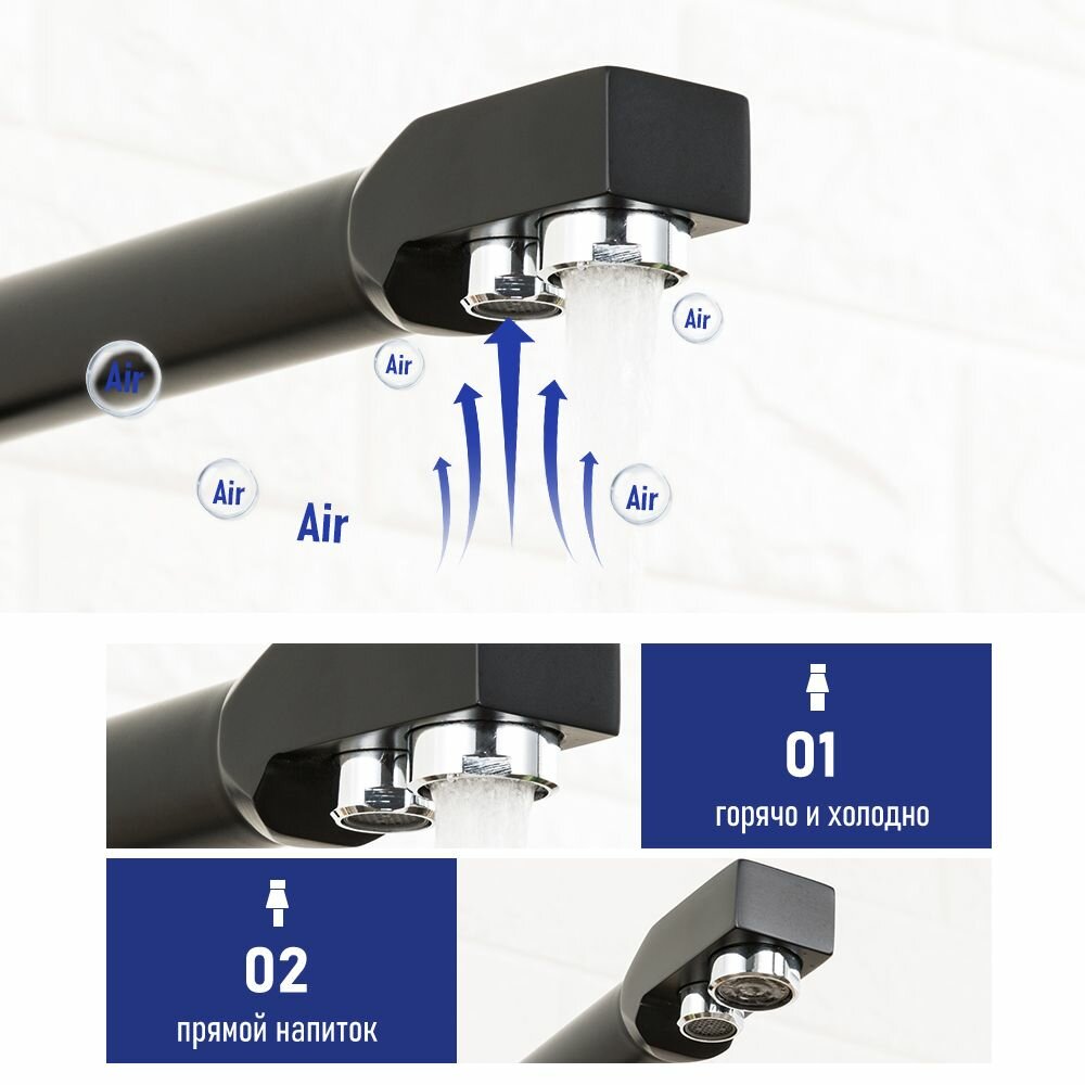 Смеситель для кухни с фильтром кухонный кран для питьевой воды Frap Y40103-2 черный – это превосходное решение для современной кухни. Этот смеситель выполнен из высококачественного латуни, обеспечивающего его долговечность и надежность. Черный цвет добавит вашей кухне стиль и элегантность. Гибкий излив позволяет удобно наполнять большие емкости, делая процесс приготовления пищи более комфортным. Смеситель оснащен эргономичным кран-манипулятором, который легко регулируется, обеспечивая точное управление потоком воды. Этот смеситель отличается экономичностью использования и легкостью ухода. Он станет отличным дополнением к вашей кухне, сочетая в себе функциональность и стиль.