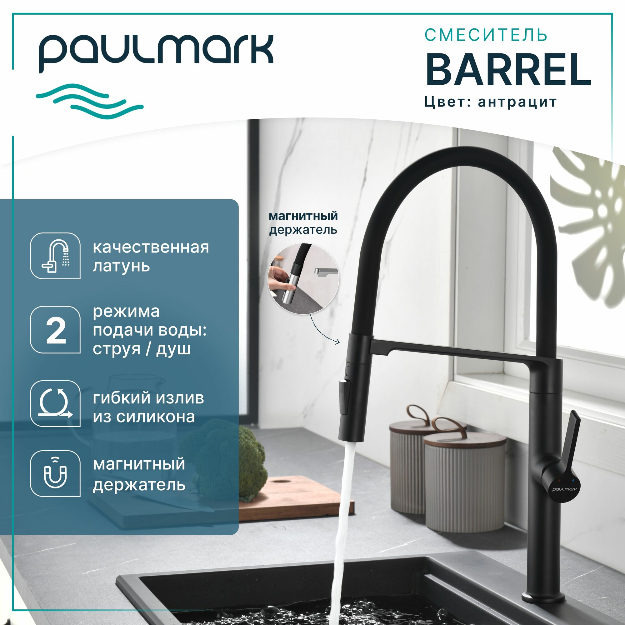 Смеситель для кухни с гибким изливом Paulmark BARREL антрацит (черный матовый), Ba214029-AN: сравнение цен, характеристики, фото, актуальное наличие и цены.