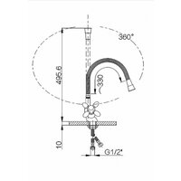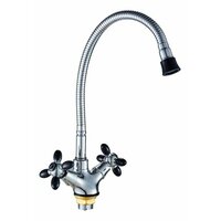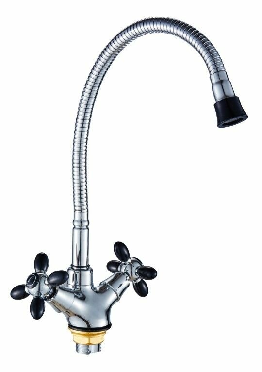 Особенностью смесителя является высокий поворотный гибкий излив, который позволяет легко заполнить или вымыть емкость больших габаритов или направить струю в трудно доступную часть мойки. Это значительно облегчает уход за кухонной мойкой.