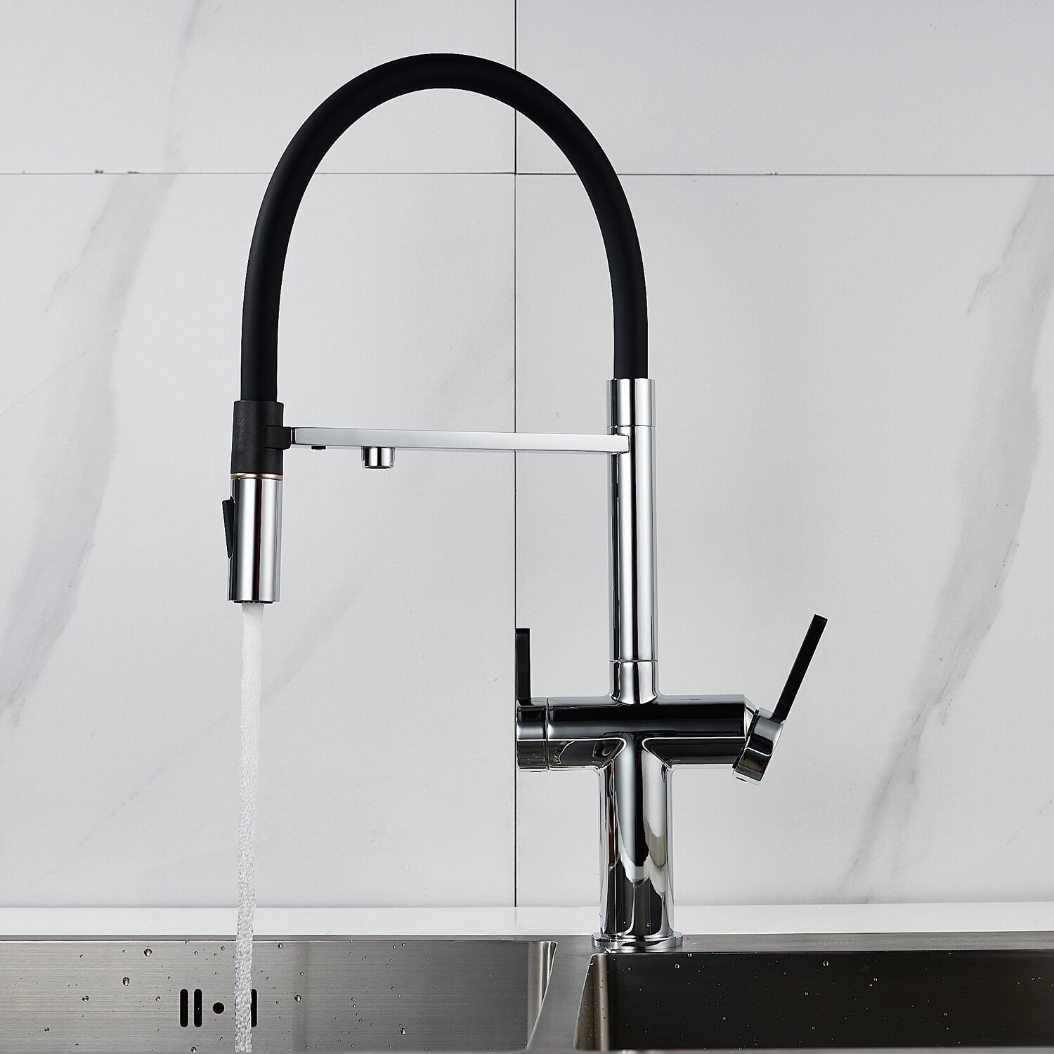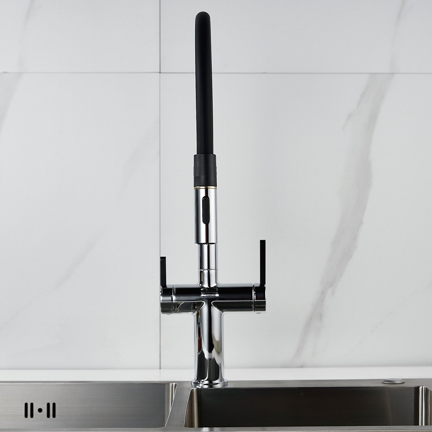 Смеситель оснащен переключателем на фильтр, что позволяет использовать очищенную воду из фильтра для приготовления пищи.