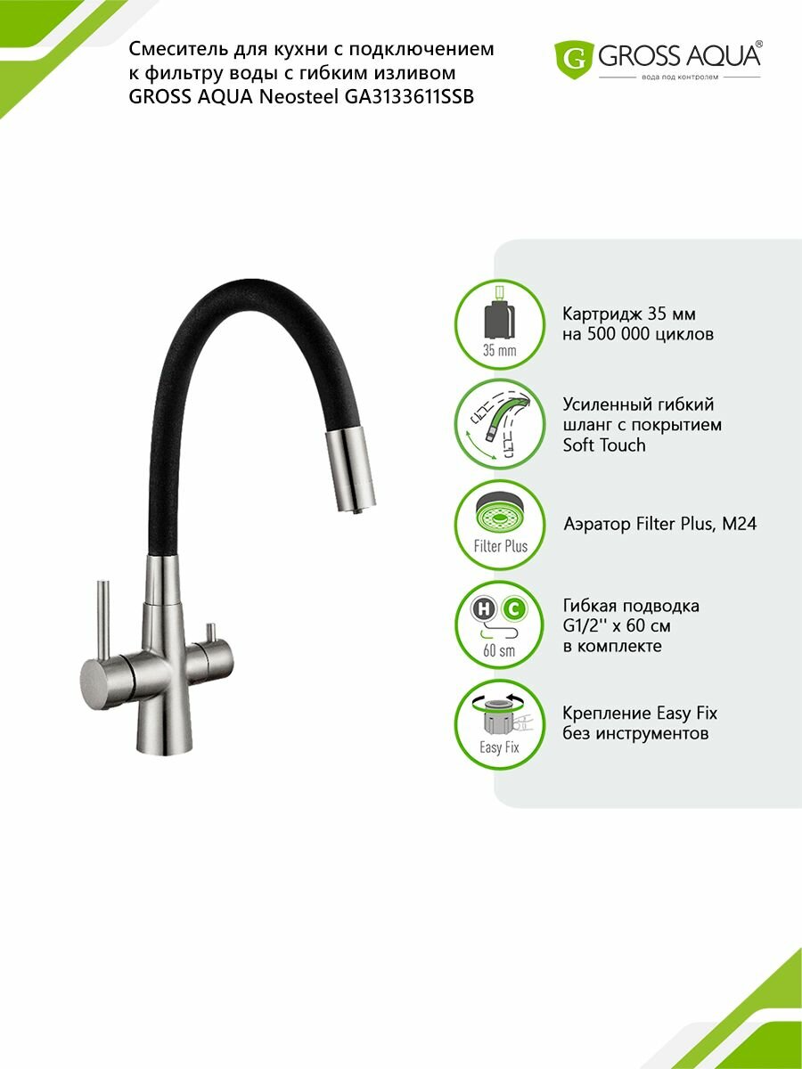 Купить Смеситель для кухни с гибким изливом и подключением к фильтру воды GROSS AQUA Neosteel, нержавеющая сталь, хром, 3133611SSB с доставкой по всей России. Смеситель для кухни с гибким изливом и подключением к фильтру воды GROSS AQUA Neosteel, нержавеющая сталь, хром, 3133611SSB: сравнение цен, характеристики, фото, актуальное наличие и цены.