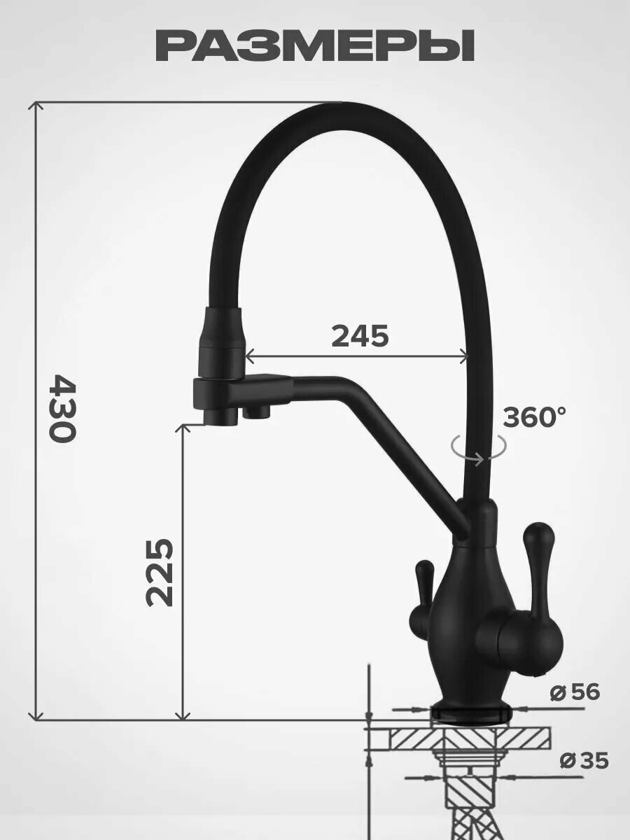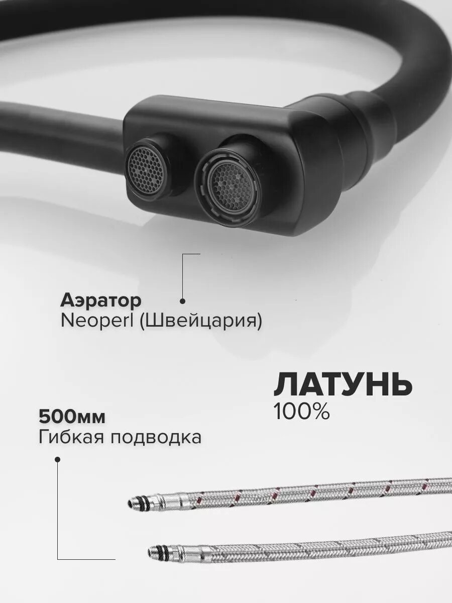 Смеситель для кухни с фильтром для питьевой воды (фильтр приобретается отдельно) и гибким изливом Rose R858H черный, черный матовый. Смеситель для кухни с подключением к фильтру питьевой воды, изготовлен из высококачественной латуни CW617N. Данный сплав латуни безопасен для здоровья, прочный, стойкий к коррозии. Аэраторы Neoperl (Германия) гарантируют, ровный и мягкий поток воды без разбрызгивания и шума. Смеситель с фильтром комплектуется надежными картриджами 35 мм. SEDAL (Испания), обеспечивающие увеличенный срок службы смесителя. В комплекте идет смеситель для фильтра, набор гибкой подводки 1/2 длинной 500 мм и монтажный набор для крепления смесителя. Смеситель для фильтра питьевой воды имеет два носика излива, для подачи проточной и питьевой воды. В комплект смесителя входит всё необходимое для быстрого и удобного монтажа. Гарантийный срок на данный кухонный смеситель составляет 5 лет.