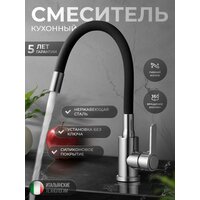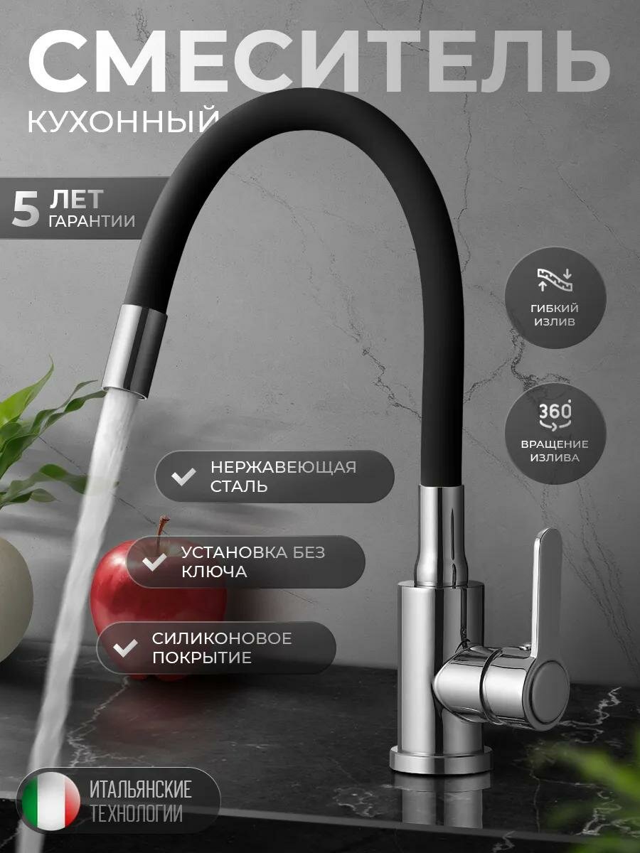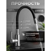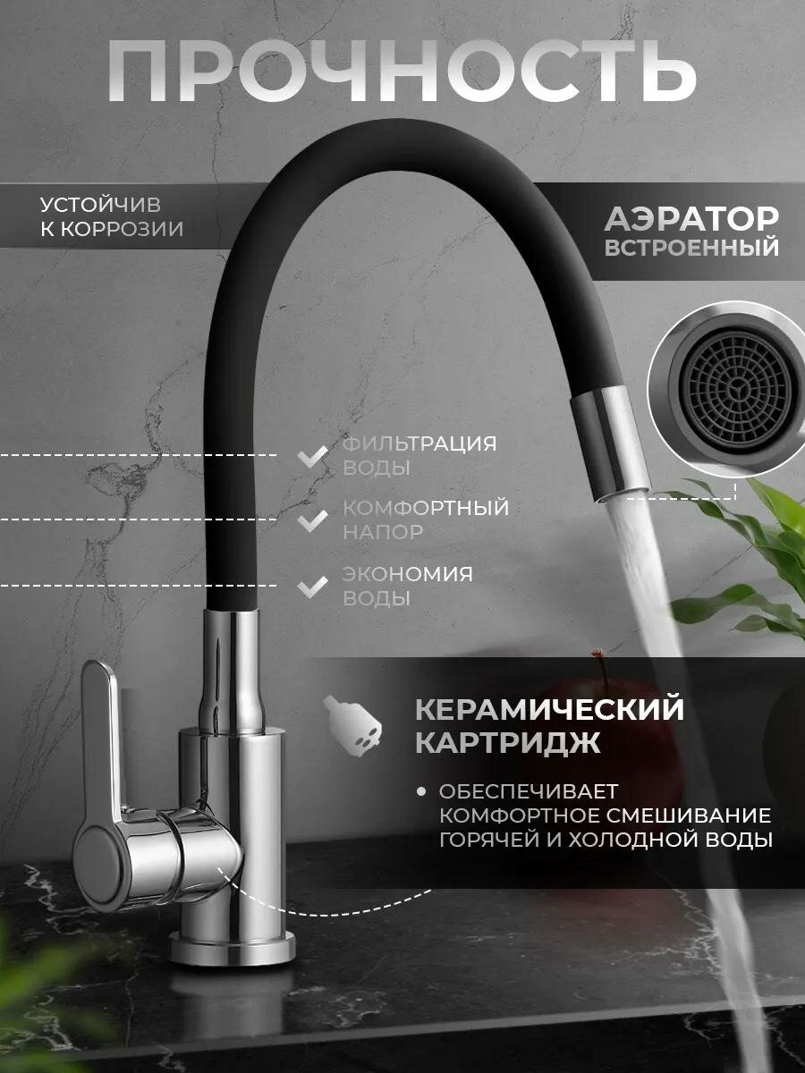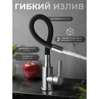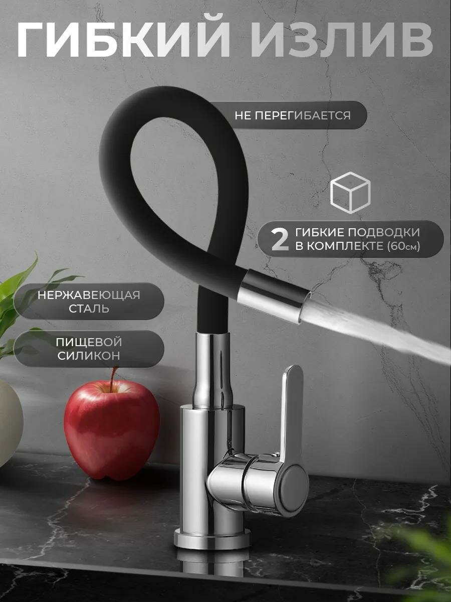 Смеситель для кухни с гибким изливом из высококачественных материалов. Гибкий и поворотный носик позволяет помыть что-то объёмное (противень, большую кастрюлю, сковородку). Устойчив к отложениям солей на корпусе. Отлично подходит как к классическому, так и к современному дизайну кухни. Комплектуется гибкой подводкой и высокой гайкой крепления для простой установки.