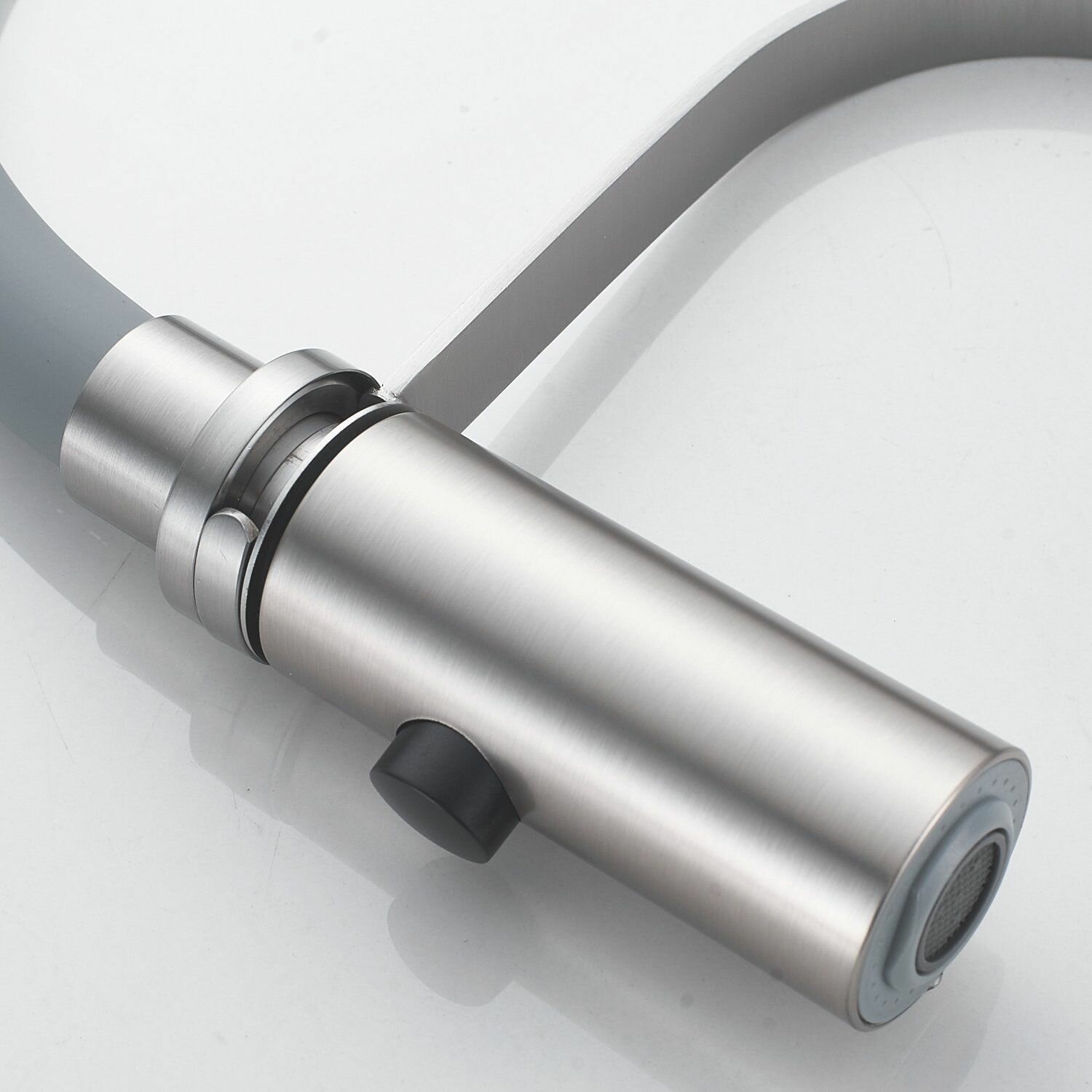 Смеситель для кухни с гибким изливом Цвет: Сатин Материал: Нержавеющая сталь/Силикон Картридж: керамический Подводка: 450 мм гибкая подводка ½ Технология: Испанская Гарантия: 5 лет