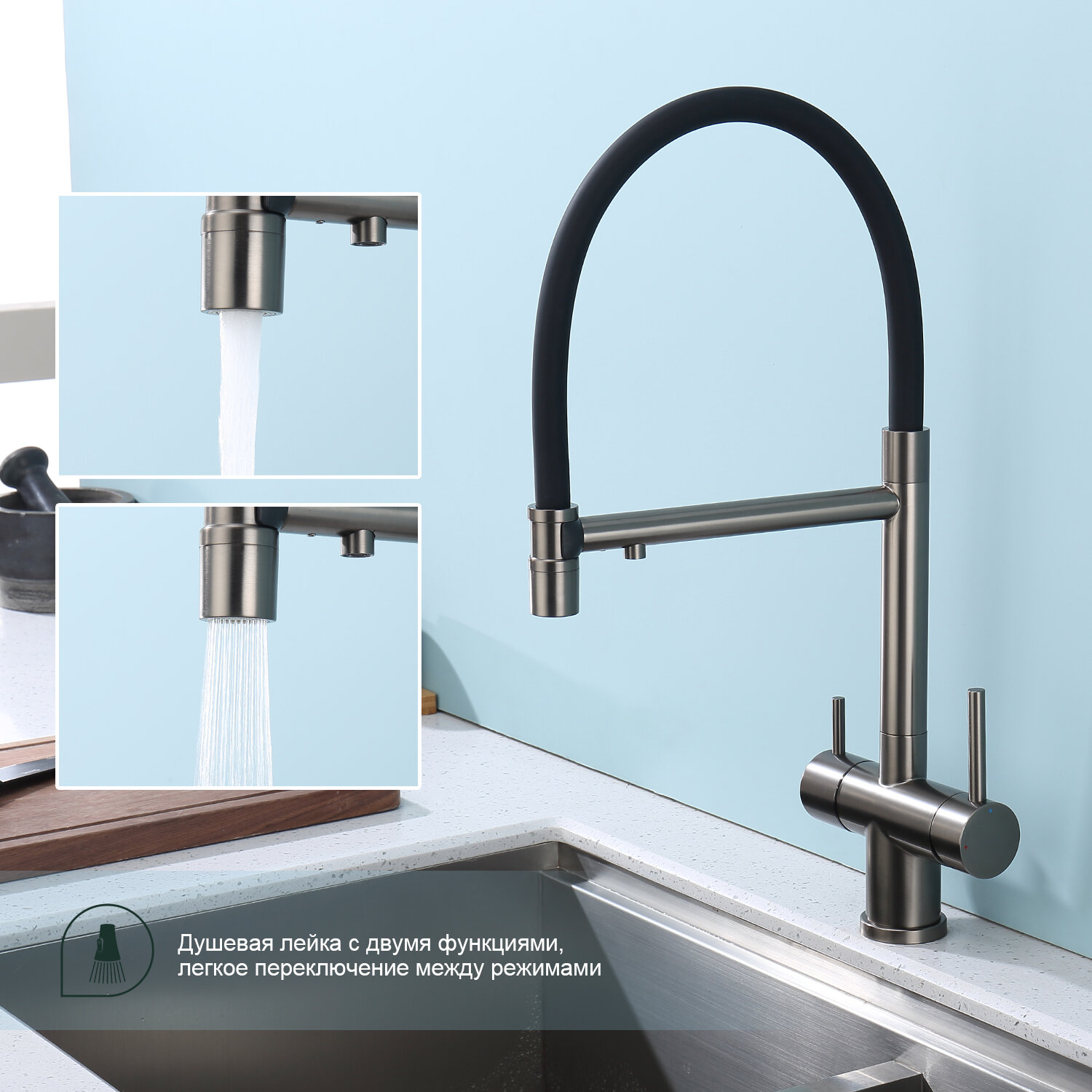 Купить Смеситель кран для кухни с гибким изливом Splenka S70.63.09, графит + черный с доставкой по всей России.