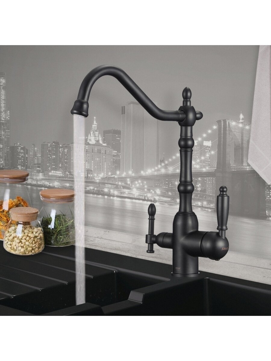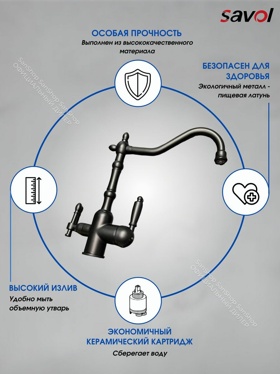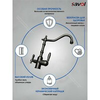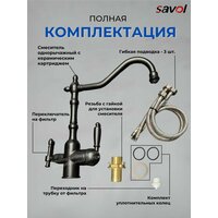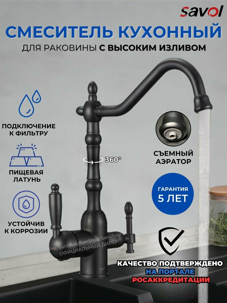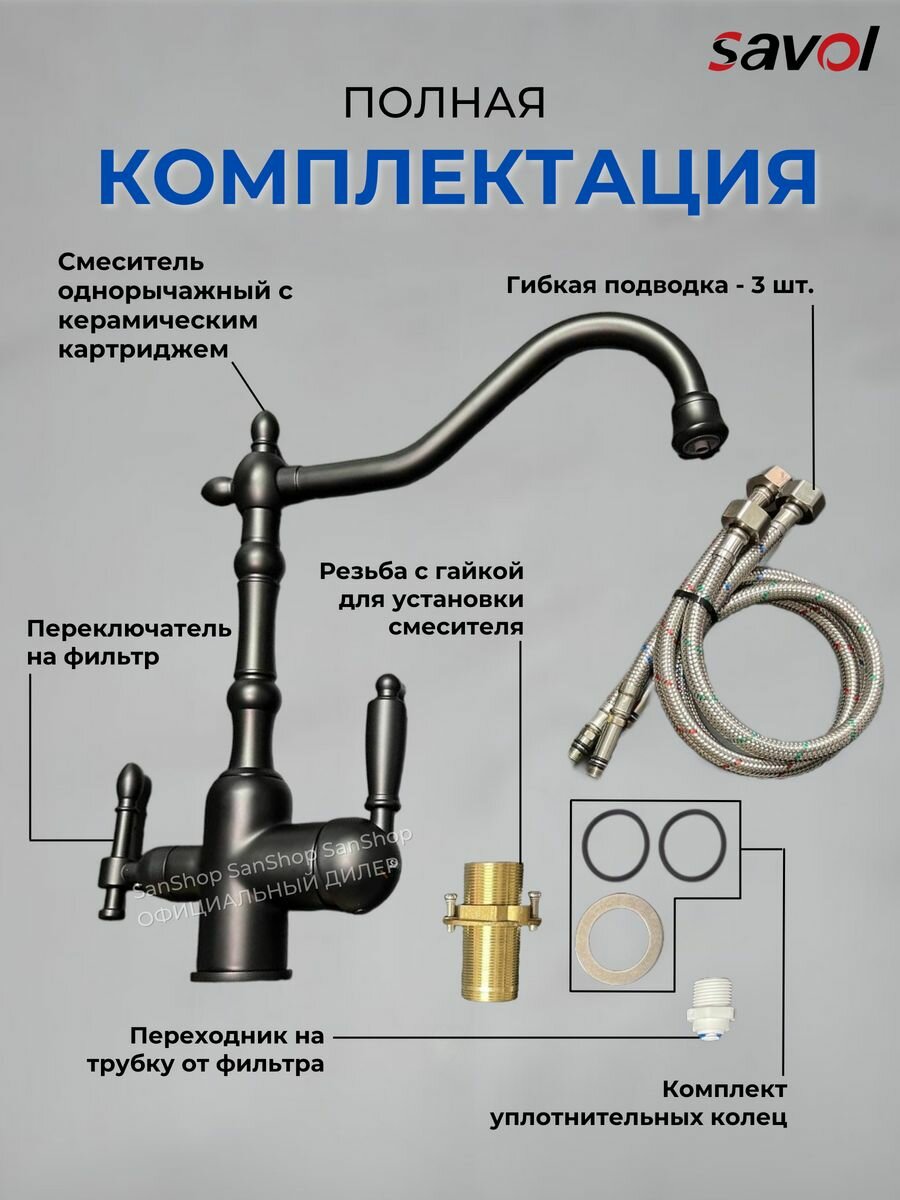 Компания Savol предлагает вам линейку смесителей из латуни, которые соответствуют всем требованиям современных хозяек. Качественный латунный сплав обеспечивает максимальную прочность изделия. Надежное покрытие обеспечивает долгую механическую износостойкость деталям. Благодаря системе 2 в 1, можно подключить фильтр для воды не делая дополнительных отверстий в мойке или столешнице. Высокий и поворотный носик позволяет помыть что-то объёмное (противень, большую кастрюлю, сковородку). Монтируется смеситель на одно отверстие и притягивается латунной гайкой, которая жестко фиксирует кран не позволяя в дальнейшем ему разбалтываться на мойке. Для подключения комплектуется гибкой подводкой. Подойдет на столешницу глубиной не более 4см. Смеситель комплектуется гибкой подводкой 45см и шлангом для фильтрованной воды 25см и переходником. Модный, высокий, смеситель в современном, оригинальном дизайне, с прочным, литым корпусом из высококачественной латуни, с гибкой подводкой, с удобным изливом, с керамическим картриджем, со съемным аэратором, без выдвижной лейки, без донного клапана, без сколов и царапин, как лучшая сантехника для дома и дачи на кухню для кухонной мойки посуды, для накладной раковины чаши, умывальника в ванную комнату, для экономии воды в классическом черном, матовом цвете и в серебряном, в металлике. Удобный, красивый, недорогой кран с металлической рукояткой, с механическим, ручным управлением имеет свойство шумоподавления, работает бесшумно с надежной эксплуатацией, выдерживает перепады давления воды, легко моется и не ржавеет, хорошо регулирует напор на каждый день для ежедневного использования, круглый год, на все сезоны. Шикарная модель смесителя подойдет для любого интерьера - это универсальный подарок на новоселье, юбилей.