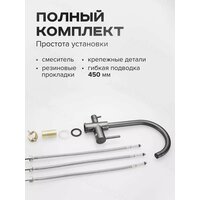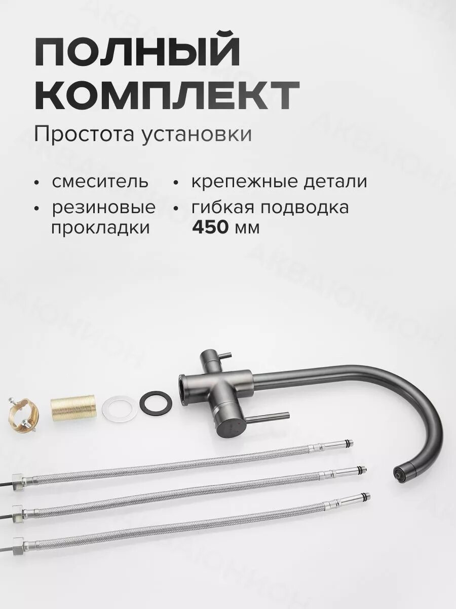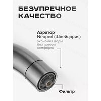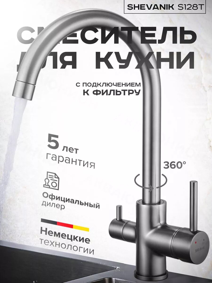 Смеситель для кухни c фильтром S128T - стильная модель в современном стиле, изготовленная из латуни CW617N. Он выполнен в цвете оружейная сталь, что делает его одновременно неординарным и интересным к покупке решением. Покупая смеситель для кухни (латунь) для себя или на подарок близкому, вы никогда не прогадаете. Все потому, что он способен стать настоящей находкой для каждой домохозяйки без исключения. Смеситель для кухни с подключением к фильтру питьевой воды имеет досконально продуманное строение: поворачивается на 360 градусов; оснащен двумя режимами потока, поступающим через излив, предназначенный для мытья овощей, фруктов и других продуктов и краном для фильтрованной воды. Такой кран для кухни идеально подойдет для сторонников ЗОЖ, ведь поступающая через его фильтр вода идеально очищается. С ним вы также можете сэкономить - под кран для питьевой воды не потребуется проделывать дополнительные отверстия и платить за это деньги. Выбирая этот кухонный смеситель с фильтром изливом, вы можете быть уверены в его первоклассном качестве исполнения. Он устойчив к появлению коррозии, царапин и сколов. За счет этого кухонный кран смеситель имеет длительный эксплуатационный срок. Обычно производитель устанавливает на модель гарантию до 5 лет. Выбирая 100% латунь, вы всегда получаете прочный кран для кухни отличающийся интересным дизайном. Будучи исполненным с применением комбинированных материалов - пластика, латуни и силикона - смеситель для кухни латунь имеет оригинальный внешний вид, который можно использовать для создания стильных акцентов. Так смеситель для кухни с фильтром для питьевой воды гарантированно станет настоящим украшением интерьера. Смеситель для кухни с фильтром - практичное решение, с установкой которого справится каждый. Для удобства покупателей смеситель на мойку и кран для фильтра питьевой воды оснащен дополнительной инструкцией по монтажу. Соблюдая ее, смеситель для кухни 2 в 1 можно установить всего за несколько минут. В уходе смеситель на кухню с фильтром прост, как и в установке. Чтобы очистить смеситель для кухни с подключением к фильтру питьевой воды, достаточно протереть его мыльной губкой, промыть водой и насухо вытереть полотенцем. Обычно смеситель с фильтром рекомендуют мыть с помощью гелей и других неагрессивных растворов. Смеситель для фильтра запрещено мыть с порошком или другими абразивными составами. Все из-за того, что он может скопить множество микроцарапин, которые не только сделают его визуально неэстетичным, но и станут причиной появления коррозии. Смеситель с фильтром на кухню требует соблюдения особых регламентов в уходе. Смеситель с фильтром для кухни отличается прекрасным внешним видом и необычным строением. В отличие от других вариантов, смеситель с фильтром для кухни не требует соблюдения сверхсложных способов подключения. Он существенно экономит время на установку, а для начала монтажа достаточно иметь под рукой базовый набор инструментов и комплект с краном. Следуя инструкции, представленной в наборе, каждый сможет осуществить установку всего за 20 минут. Выбирая смеситель 2 в 1, смеситель в кухню или смеситель для кухни с краном для фильтра, вы получаете универсальное решение для лофта, студии или большой кухни, где установлена двойная раковина. Как смеситель с подключением 