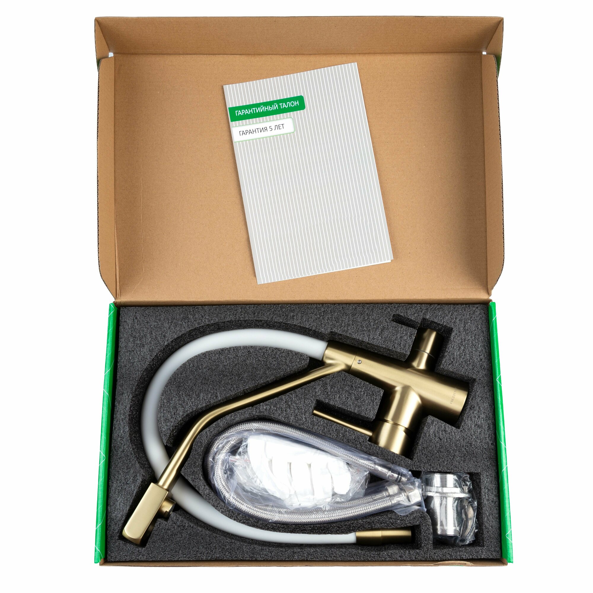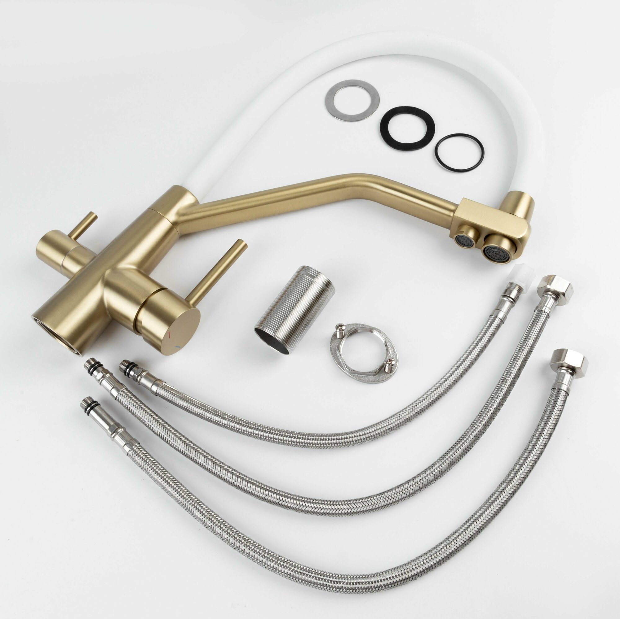 | Комплектация | Смеситель, прорезиненное уплотнительное кольцо, прокладка, крепеж, гибкая подводка под холодную и горячую воду и трубка полая под фильтрованную воду, переходник пластиковый под фильтр. |