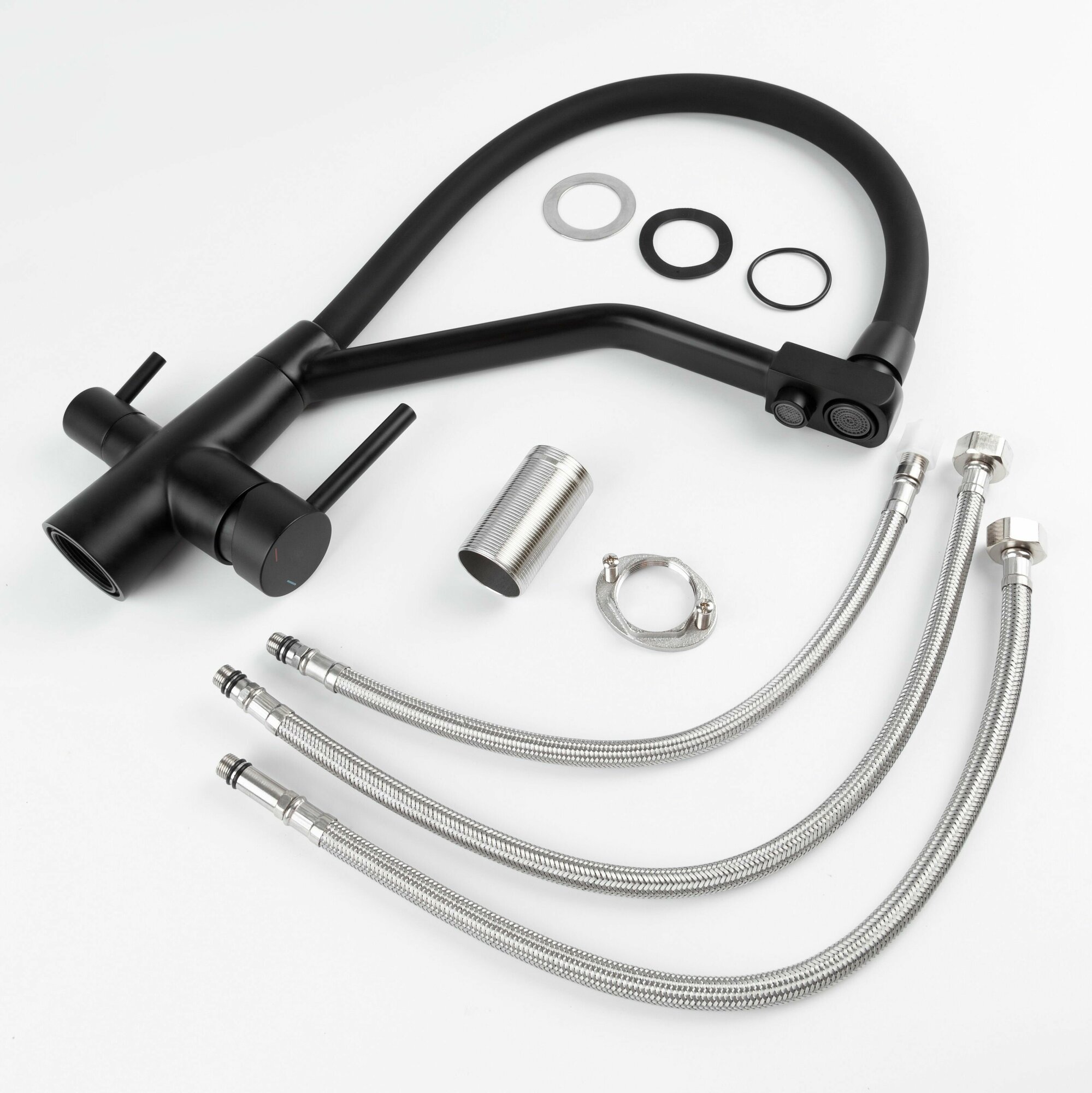 | Комплектация | Смеситель, прорезиненное уплотнительное кольцо, прокладка, крепеж, гибкая подводка под холодную и горячую воду и трубка полая под фильтрованную воду, переходник пластиковый под фильтр. |