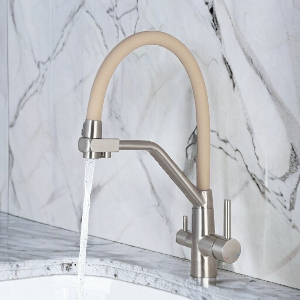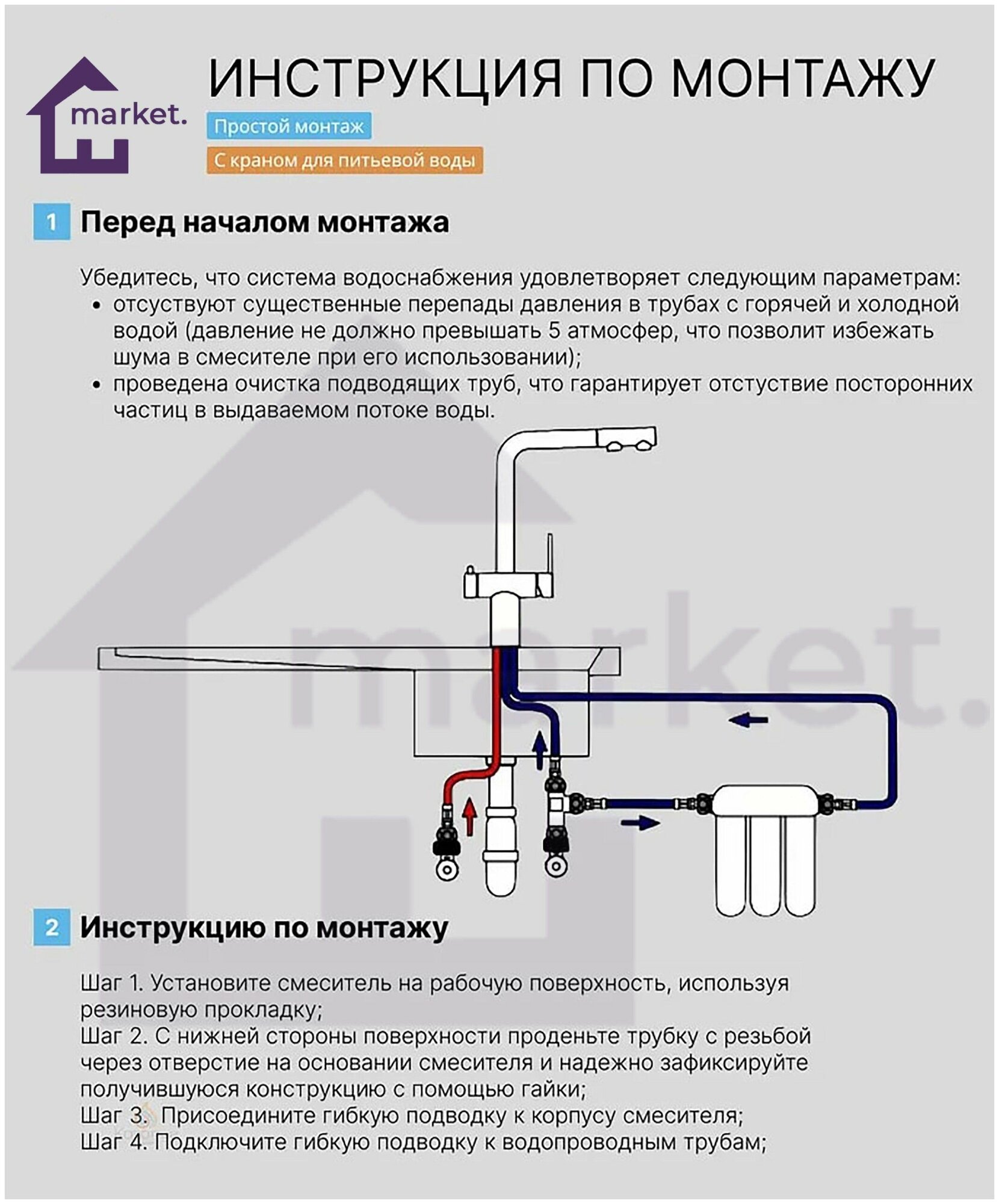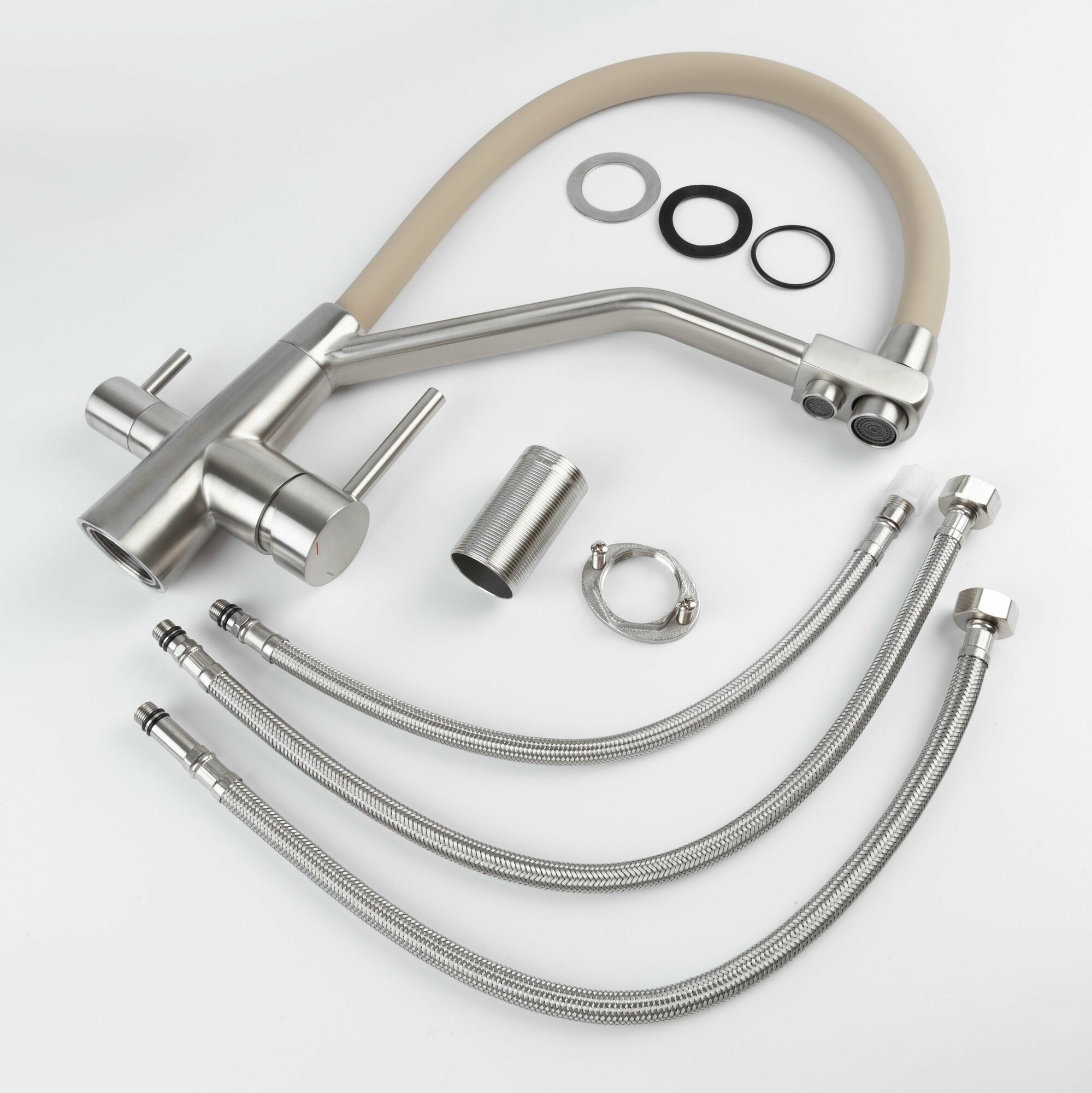 | Комплектация | Смеситель, прорезиненное уплотнительное кольцо, прокладка, крепеж, гибкая подводка под холодную и горячую воду и трубка полая под фильтрованную воду, переходник пластиковый под фильтр. |