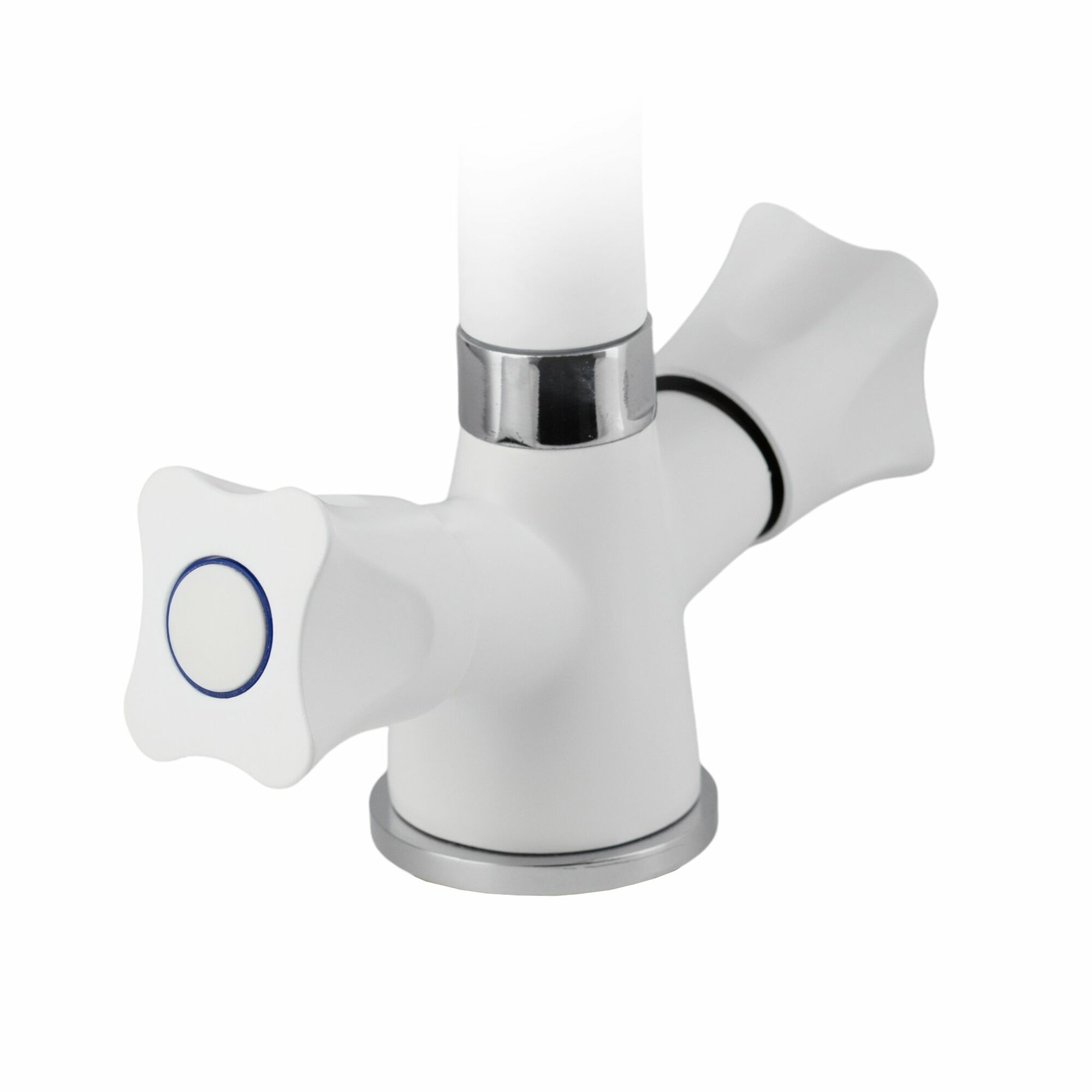 Купить Смеситель для кухни с высоким поворотным изливом и вентильными ручками, белый с хромированными вставками с доставкой по всей России. Смеситель для кухни с высоким поворотным изливом и вентильными ручками, белый с хромированными вставками: сравнение цен, характеристики, фото, актуальное наличие и цены.