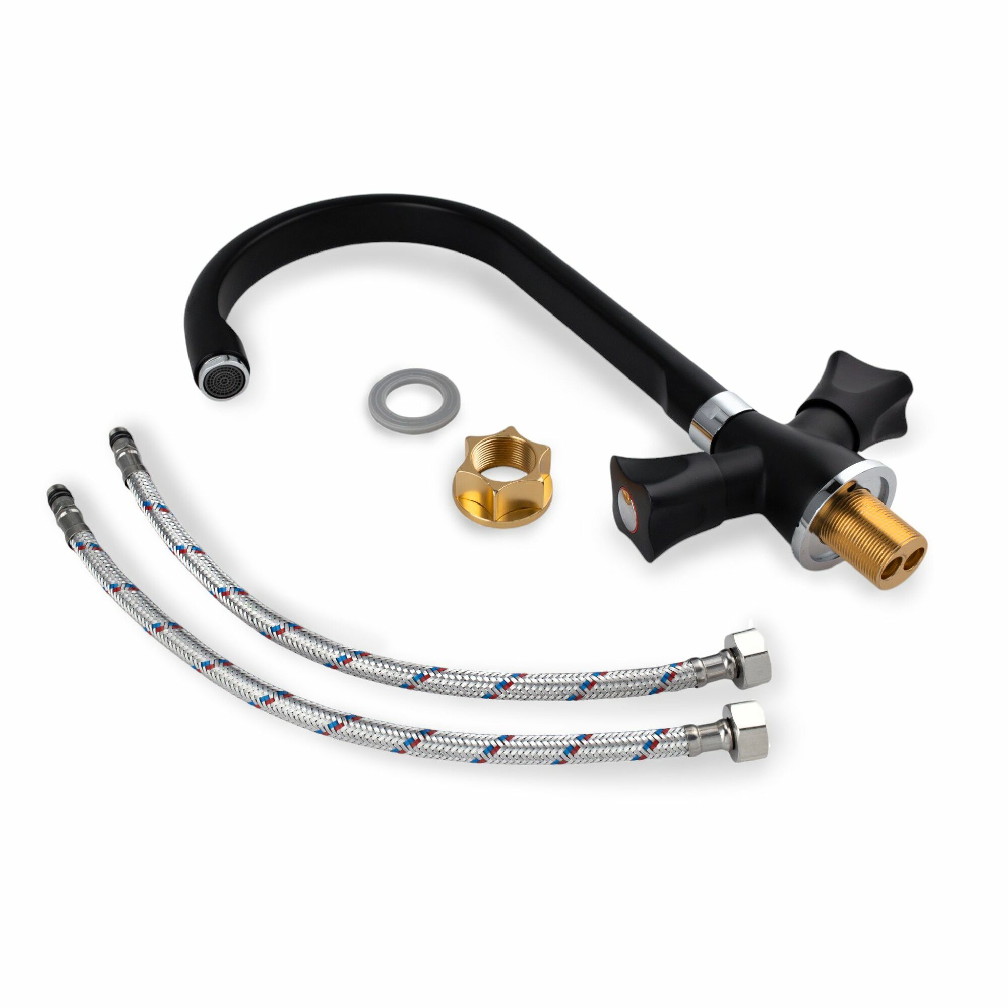 Купить Смеситель для кухни с высоким поворотным изливом и вентильными ручками, черный с хромированными вставками с доставкой по всей России. Смеситель для кухни с высоким поворотным изливом и вентильными ручками, черный с хромированными вставками: сравнение цен, характеристики, фото, актуальное наличие и цены.