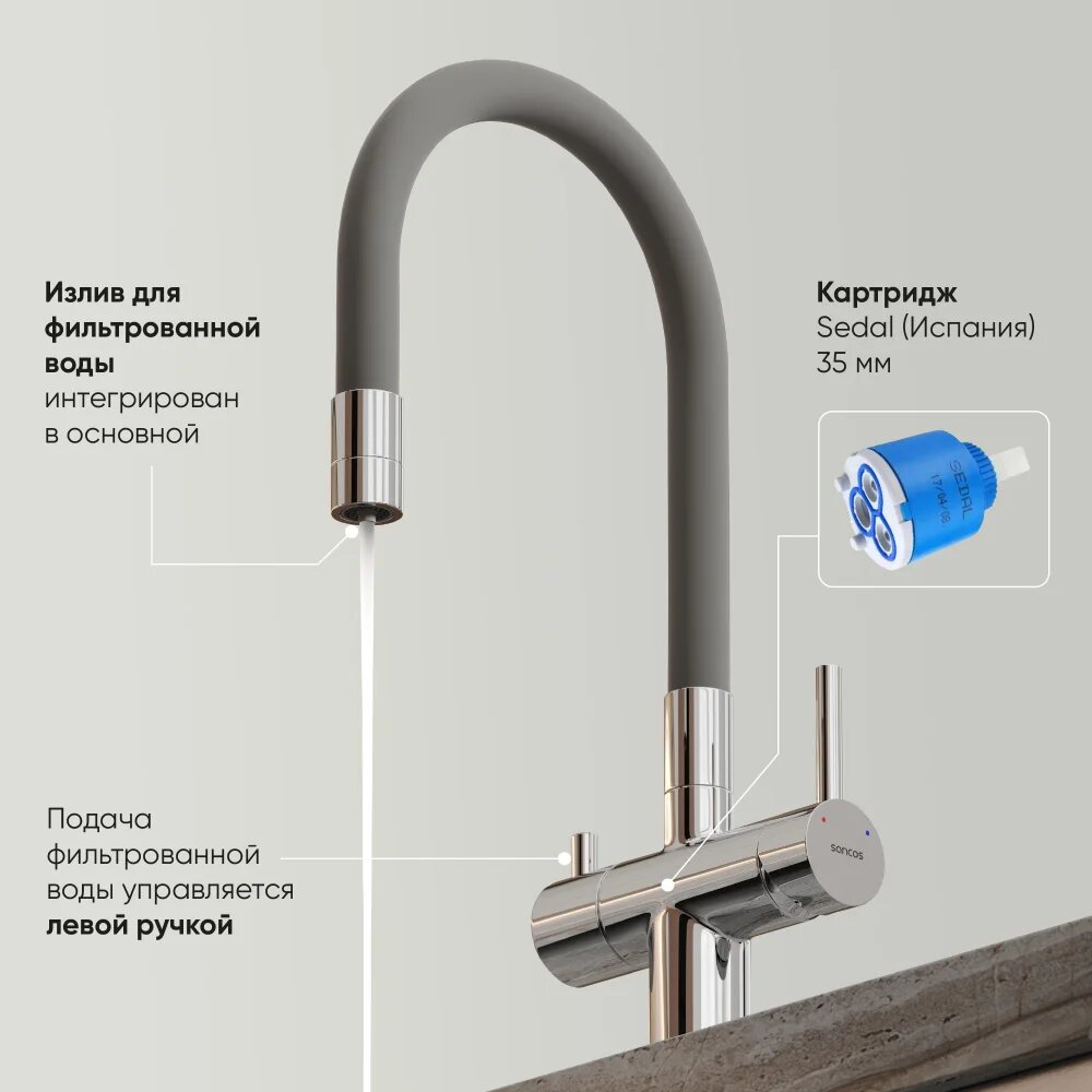 Смеситель для кухни Sancos Lucia SC4004CH хром, матовый, с поворотным изливом, серый, с краном для питьевой воды, с гибким изливом однорычажный латунный: сравнение цен, характеристики, фото, актуальное наличие и цены.