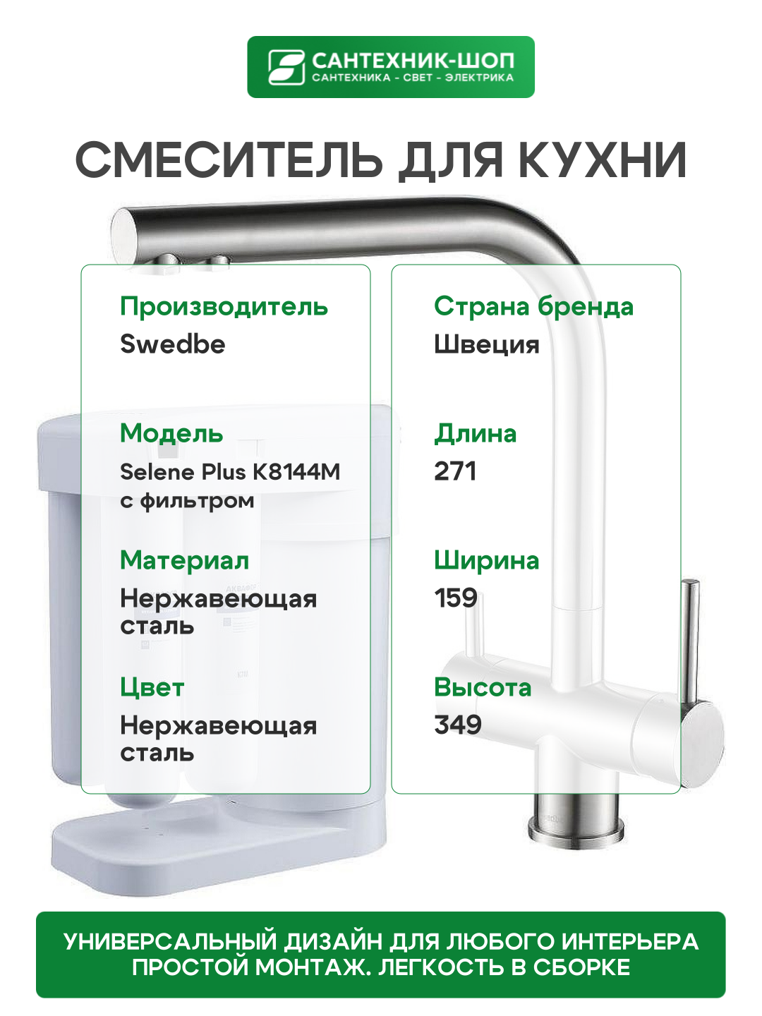 Купить Смеситель для кухни Swedbe Selene Plus K8144M с фильтром Нержавеющая сталь нержавеющая сталь Швеция с доставкой по всей России.