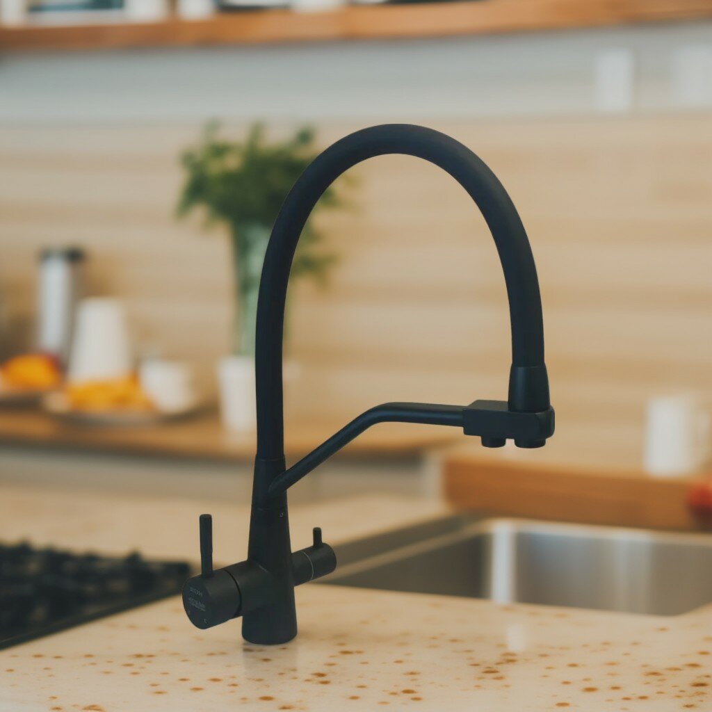 Купить Смеситель для кухонной мойки под фильтр с краном для питьевой воды и гибким изливом черный/силикон с доставкой по всей России.