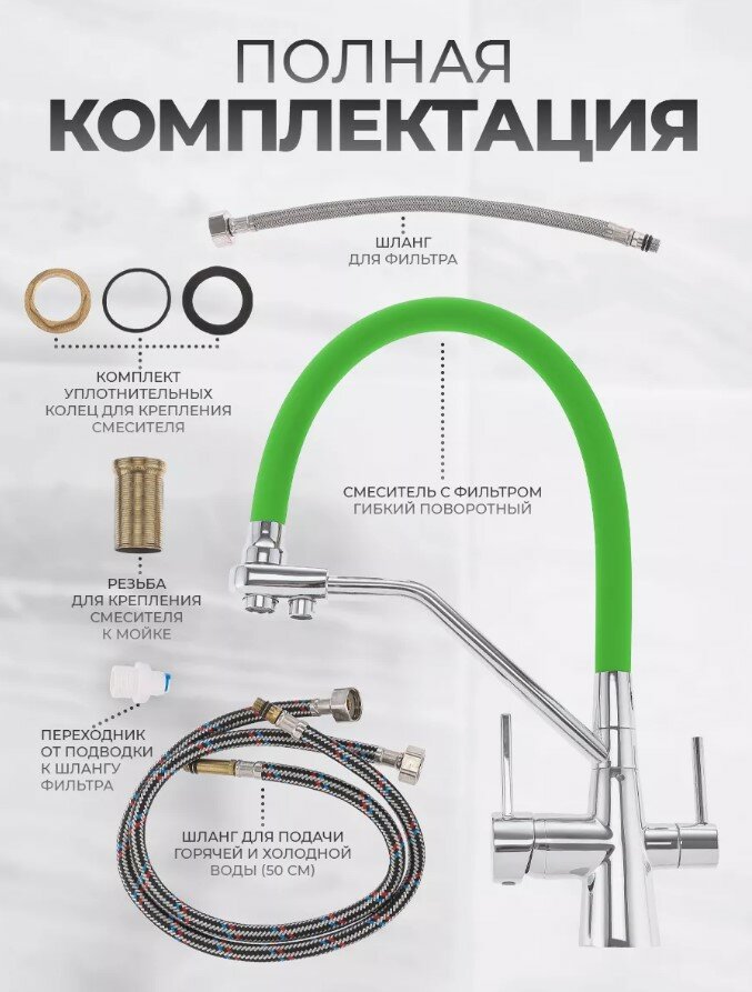 | Комплектация | смеситель для кухни, резиновое уплотнительное кольцо, монтажная трубка полая, резиновая прокладка, металлическая затяжная гайка, гибкая подводка 55 см под холодную и горячую воду - 2 шт, гибкая подводка 30 см под фильтрованную воду, переходник пластиковый под фильтр, гарантийный талон и инструкция по эксплуатации |