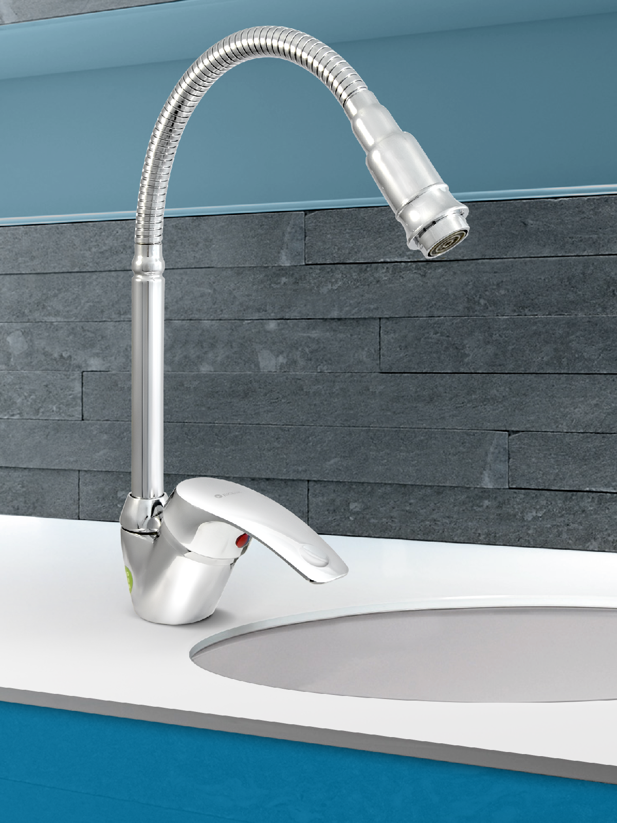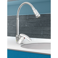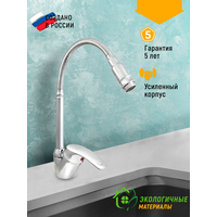 Данная модель представляет собой надежный и современный смеситель с горизонтальным способом установки, устанавливается на мойку или столешницу, максимальная толщина которой 35 мм. Тип крепления – шпилька. Смеситель имеет гибкий поворотный излив (гусак), что позволяет регулировать его глубину и высоту и создает удобство при мытье посуды и овощей, эко-сеточка аэратора выполнена из долговечного ABS-пластика, насыщает воду кислородом, и позволяет уменьшить ее расход.