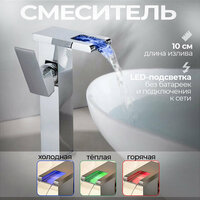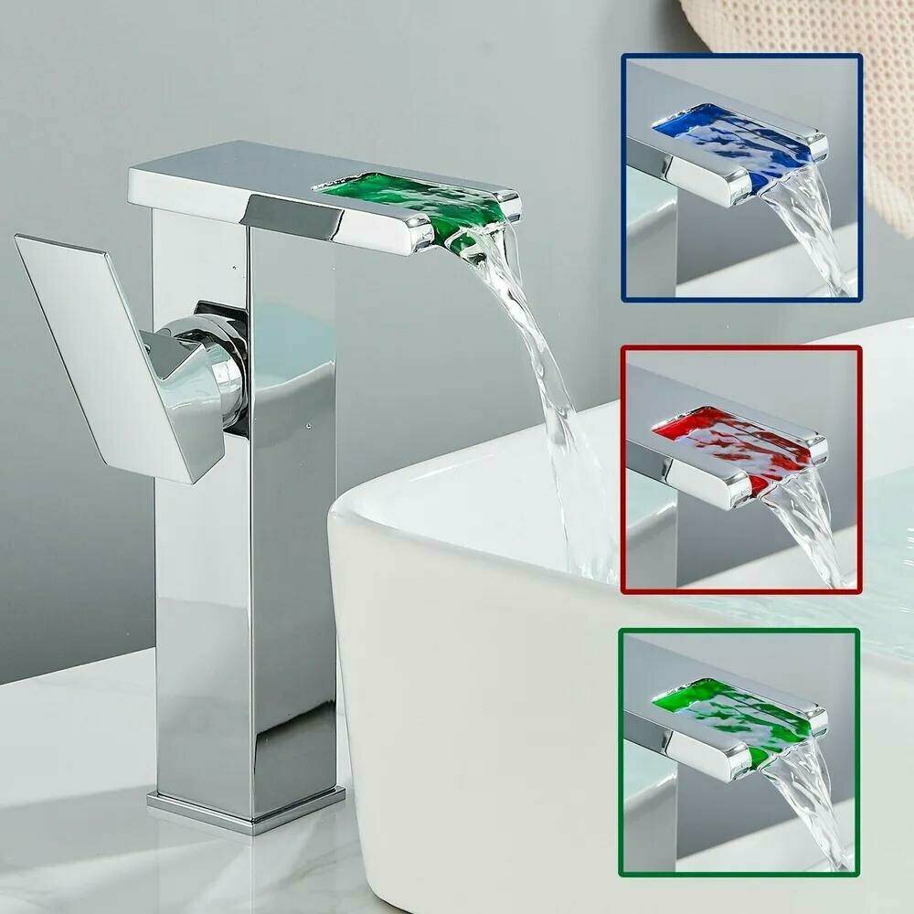 Купить Смеситель для раковины с каскадным изливом и подсветкой Bono Silver хром, кран для ванной из нержавеющей стали с доставкой по всей России.
