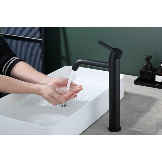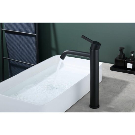 Смеситель для умывальника Splenka высокий S221.15.06 выполнен в черном цвете, что придает ему современный и стильный вид.