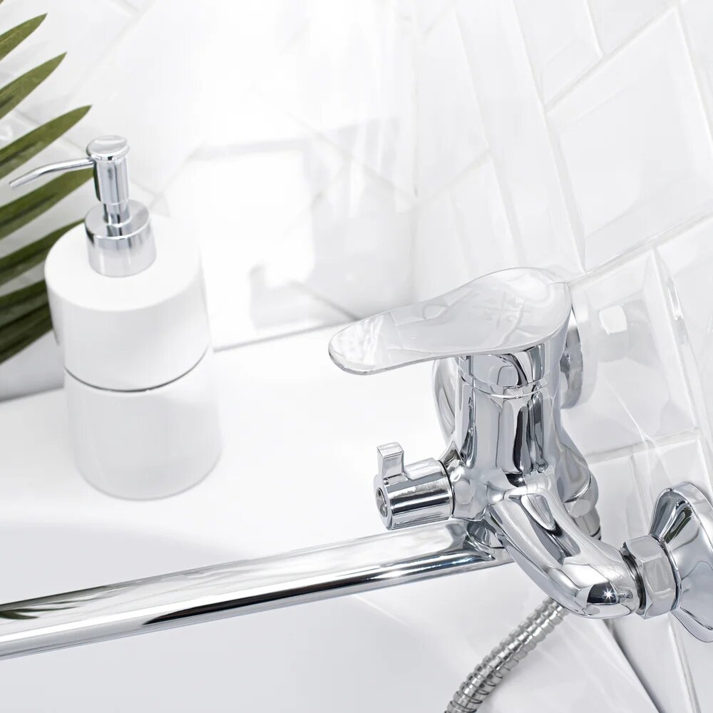 Смеситель с длинным изливом для ванны РМС SL86 SL86-006E с душевым гарнитуром, поворотный, металлический, хром, глянцевый, смеситель для ванны с душем, рычажный, с настенным держателем