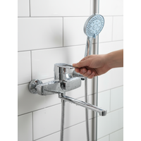Смеситель для ванны с душем, Аксессуары в комплекте (шланг 1,5 м, настенное крепление, лейка с функцией легкой очистки), Присоединительная группа (эксцентрики с отражателями) для вертикального крепления, Металлическая рукоятка