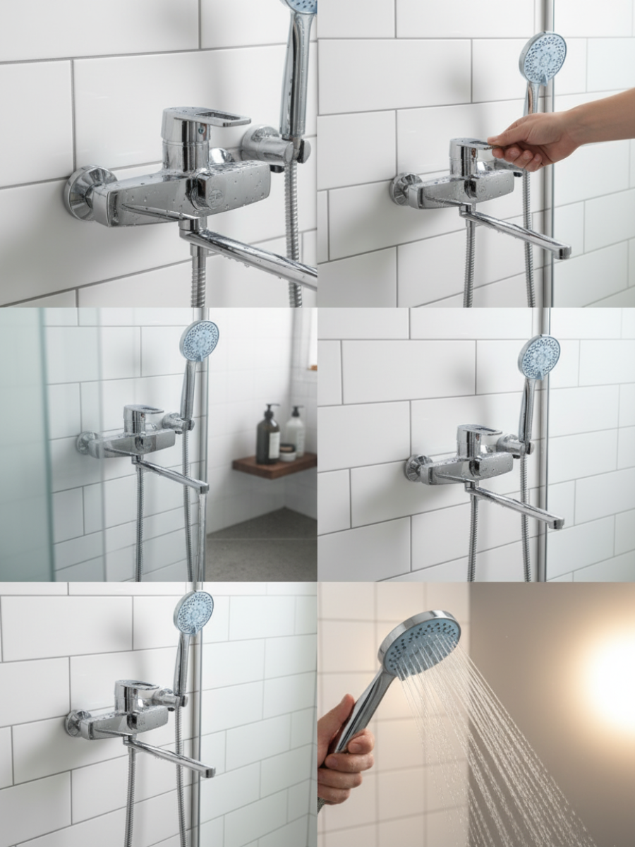 держатель лейки, излив для набора воды, лейка, набор эксцентриков, настенный держатель, отражатель, переключатель потоков, прокладки, ручной душ, смеситель, шланг