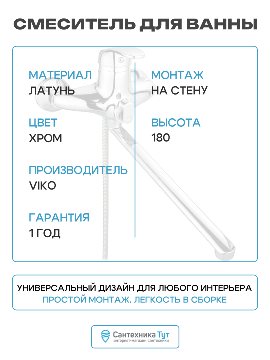 Смеситель для ванны Viko V-3215 универсальный Хром латунь на стену