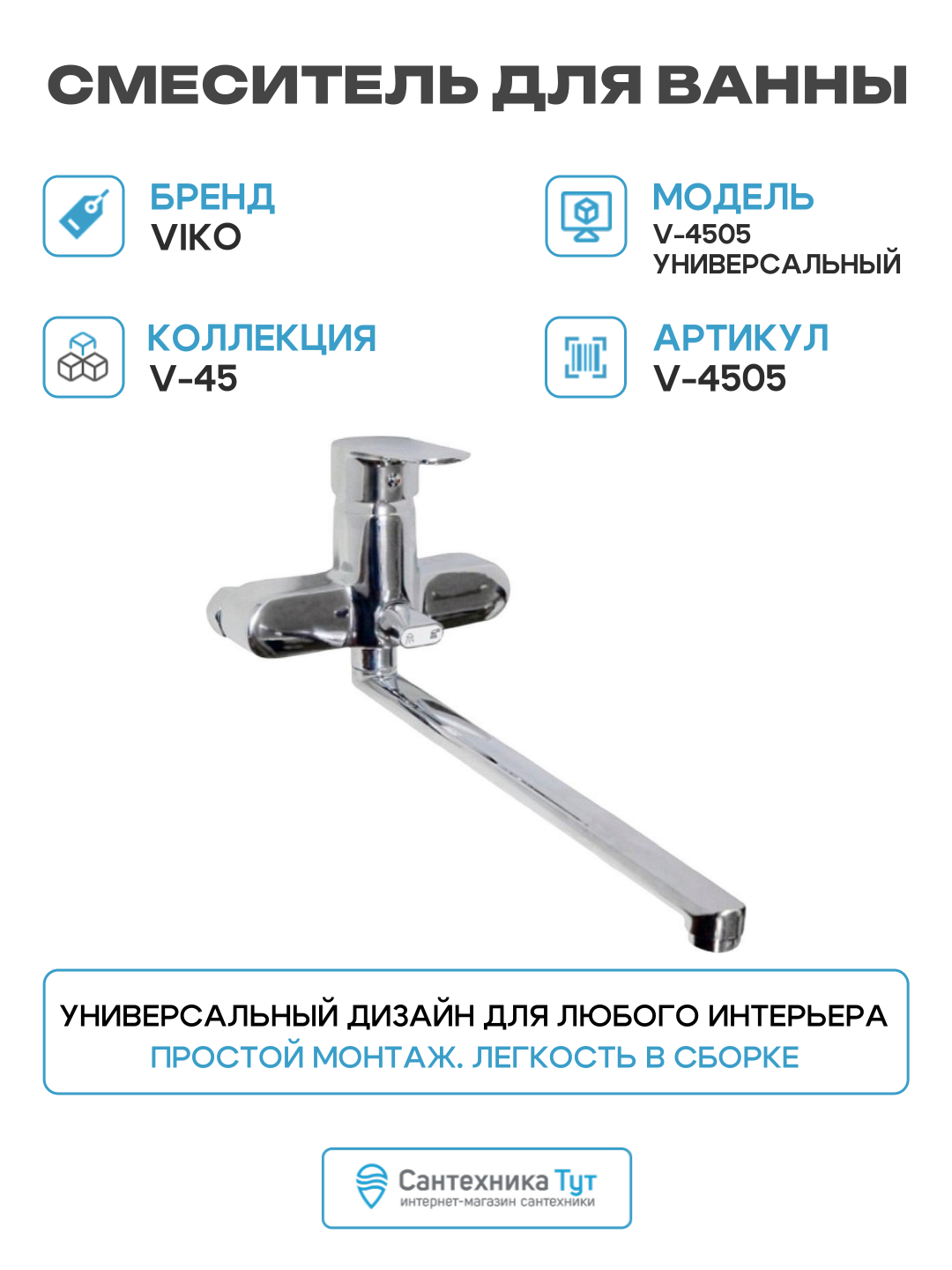 Смеситель для ванны Viko V-4505 универсальный Хром латунь на стену: сравнение цен, характеристики, фото, актуальное наличие и цены.
