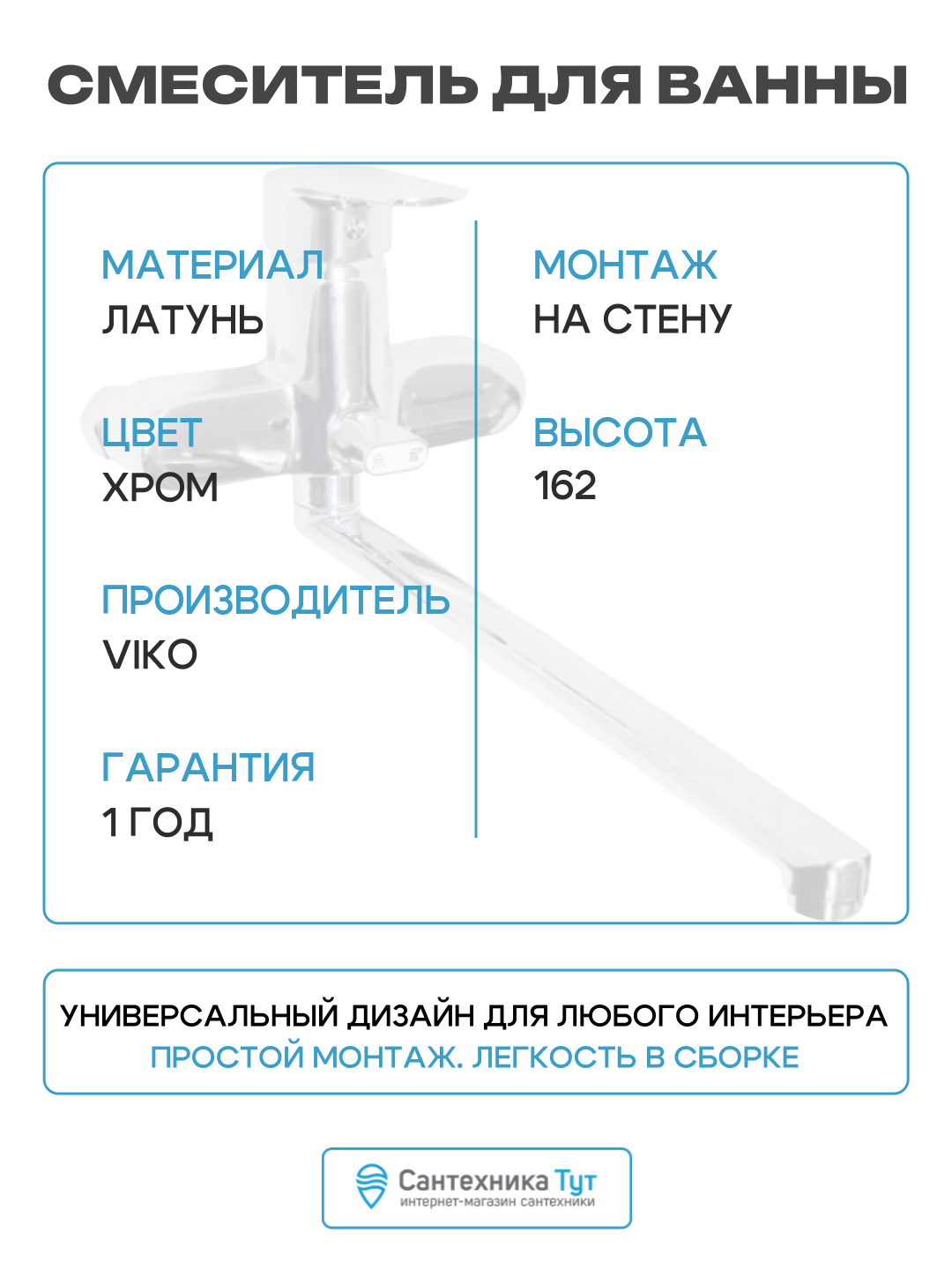 Смеситель для ванны Viko V-4505 универсальный Хром латунь на стену