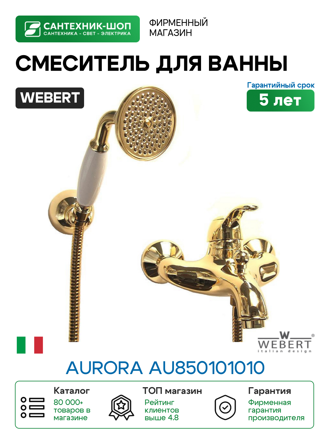 Купить Смеситель для ванны Webert Aurora AU850101010 Золото на стену с доставкой по всей России.