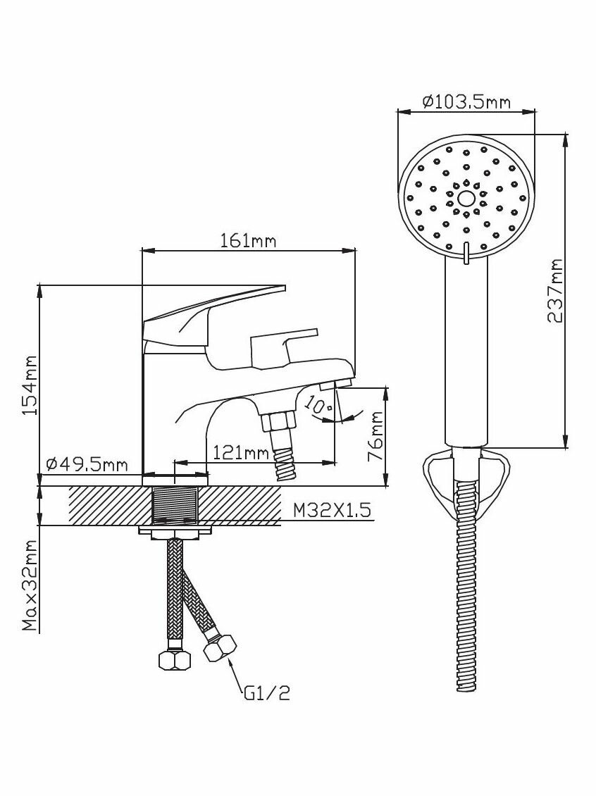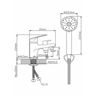 | Комплектация | смеситель, крепёж на гайке, две гибкие подводки 1/2" длиной 40 см, душевой шланг в металлической хромированной оплётке 1/2"х1/2" длиной 150 см, держатель лейки настенный 1 положение, душевая лейка 3 режима струи, паспорт изделия |