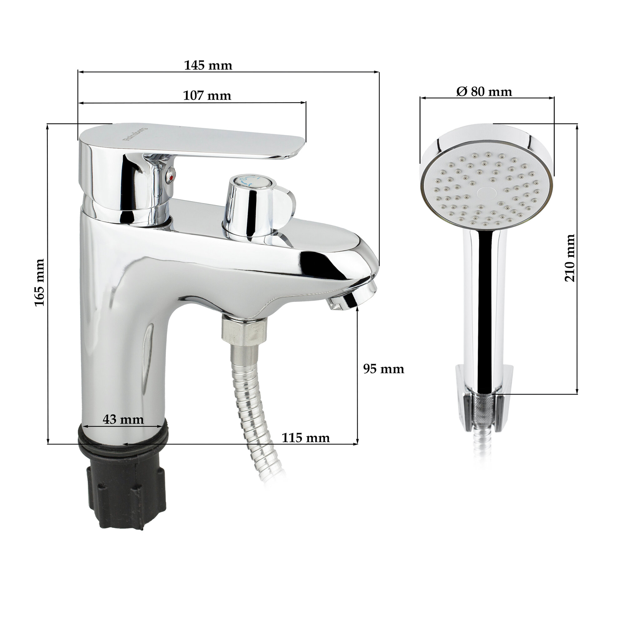 Габаритные размеры: диаметр лейки 80 мм; высота смесителя 165 мм, картридж 35 мм, диаметр корпуса 43 мм, длина гусака 100 мм, диаметр гусака 40 мм, общая длина 145 мм, диаметр основания 43 мм, толщина гусака 43 мм, длина подводки 400 мм, диаметр крепления 32 мм, высота крепления 60 мм.