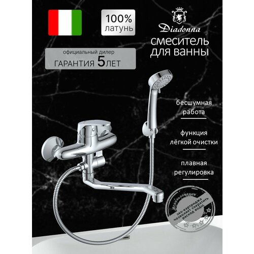 Смеситель на ванну одноручковый Diadonna D80-221124 с длинным поворотным изливом. Дивертер отдельный, между корпусом и изливом, 90°. В комплекте со смесителем душевая лейка, гибкий шланг 150 см, держатель лейки. Картридж 40 мм с керамическими пластинами.
