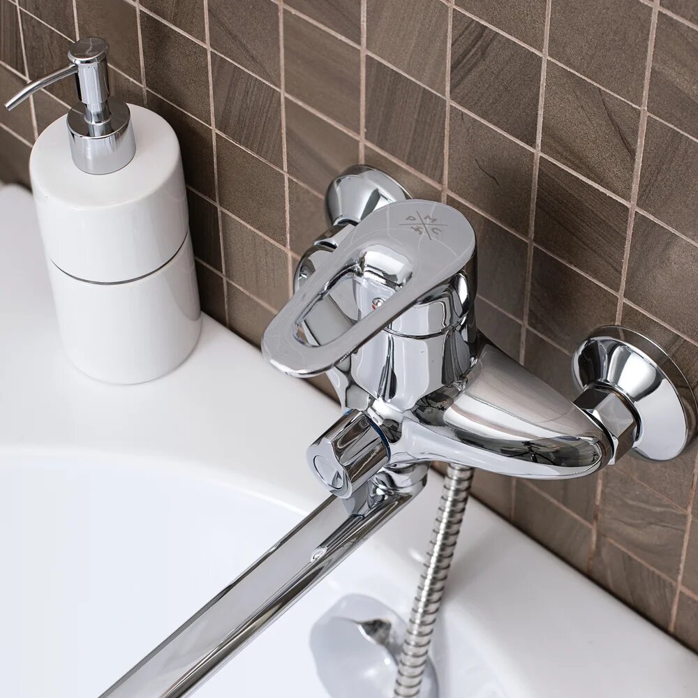 Смеситель с длинным изливом для ванны РМС SL52-006E-3 с душевым гарнитуром, поворотный, металлический, хром, глянцевый, смеситель для ванны с душем, рычажный, с настенным держателем