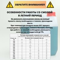 Рекомендации по работе: взболтать ёмкость со смолой, добавить отвердитель (20гр на 1 кг смолы), тщательно перемешать и можно работать. Время гелеобразования – 20-25 минут (при 2% отвердителя и комнатной температуре). Отвердитель поставляется с запасом. Для удобства смешивания и дозировки можно использовать шприц на 5мл (полный шприц на 250 гр смолы)