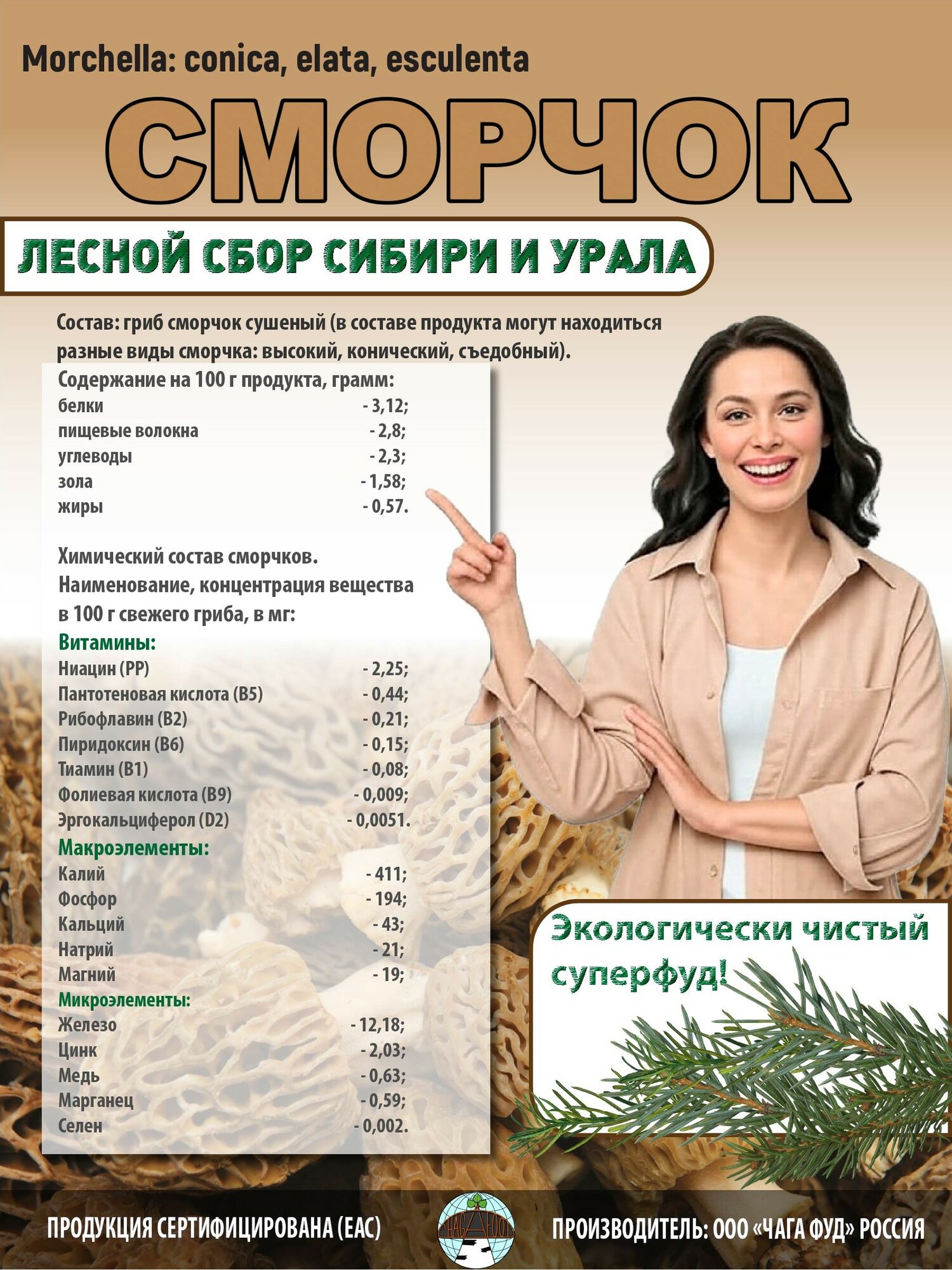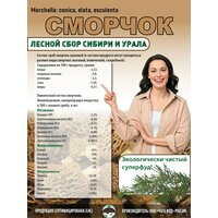 Состав: гриб сморчок сушеный (в составе продукта могут находиться разные виды сморчка: высокий, конический, съедобный), упаковка: гофрокороб, ПЭТ-пакет, 50 или 90 г.
