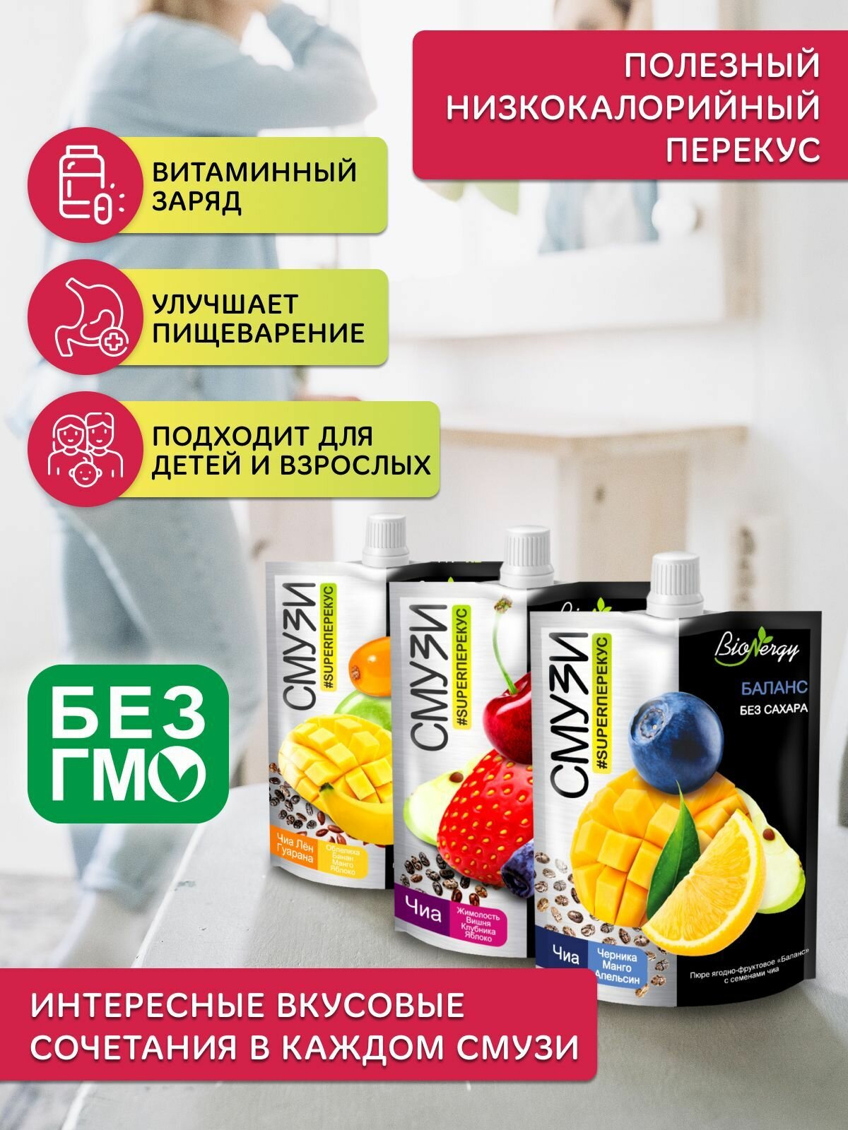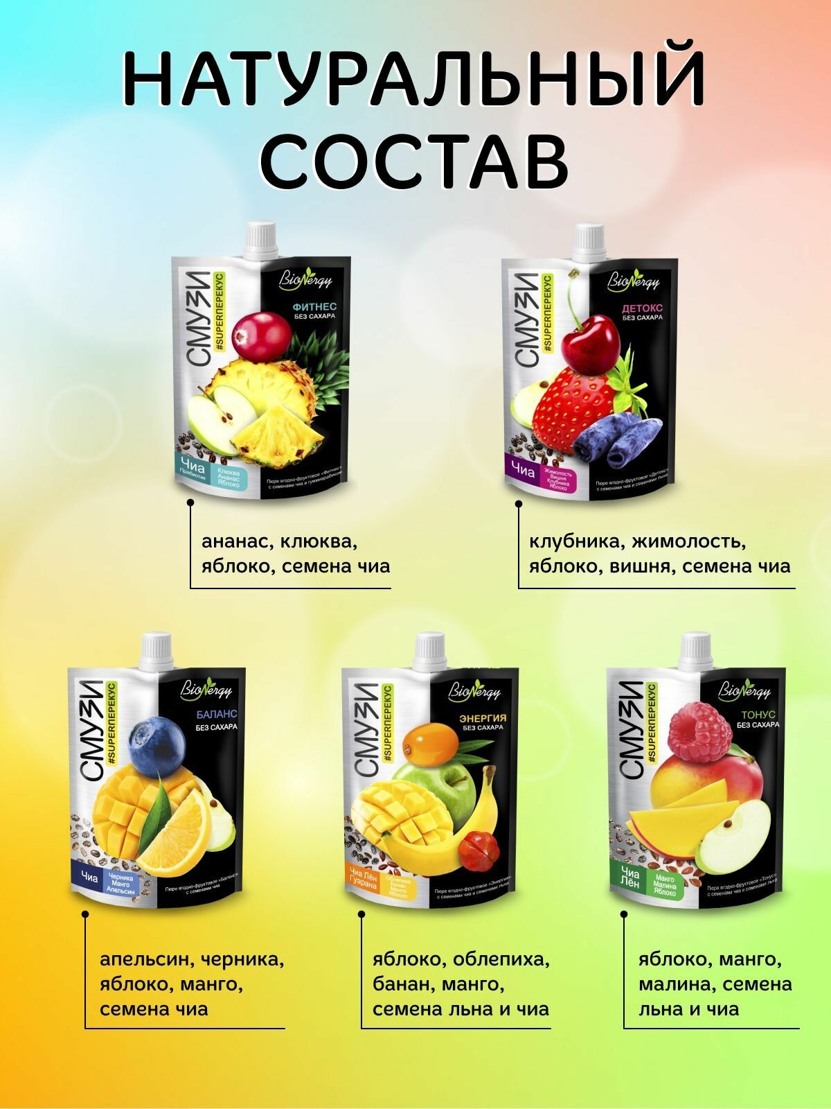 Погрузитесь в мир здоровья и свежести с нашим ассорти смузи от BioNergy! Этот продукт без сахара - превосходный выбор для тех, кто стремится к очищению организма. Каждый пакет содержит натуральные компоненты, которые помогут вам насладиться насыщенными перекусами в любое время дня.