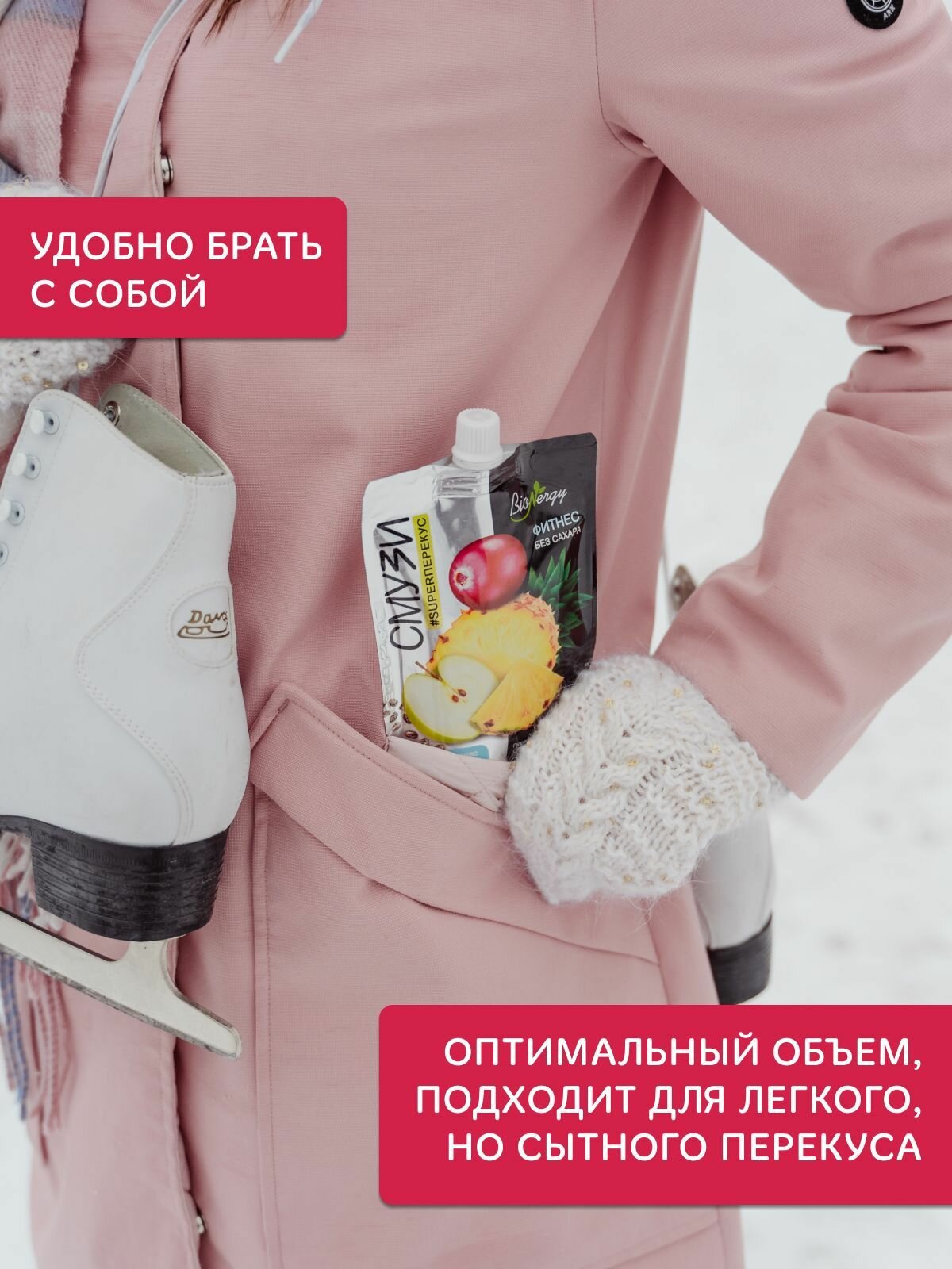 Смузи Фитнес упакован в удобные дой-паки, которые сохраняют все полезные свойства продукта. Каждая упаковка содержит 120 граммов смузи, что позволяет легко контролировать размер порции.