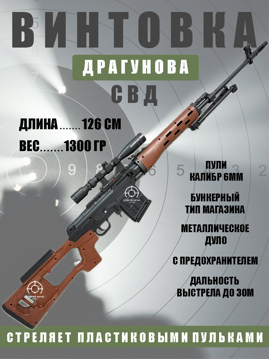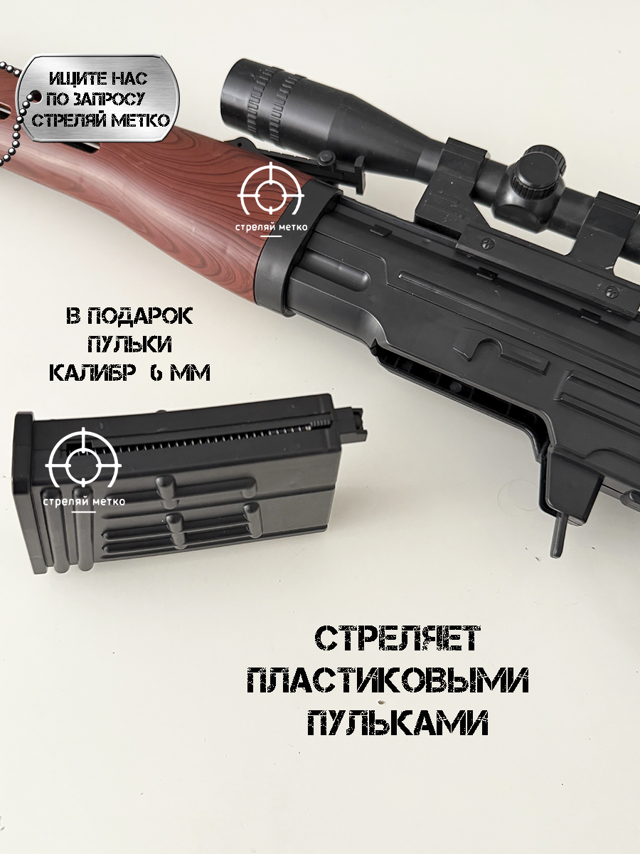 Вы ищете самый крутой игрушечный автомат с пульками? Вам повезло, потому что у нас есть именно то, что вам нужно! Наша снайперская винтовка СВД Драгунова с пластиковыми пульками 6 мм не только выглядит потрясающе, но и оснащена предохранителем, и лазерным прицелом который поможет маленькому стрелку улучшить точность и достичь невероятных результатов. Дальность выстрела до 30 метров, а скорость полета пульки до 60 м\с. Когда дело касается игрушки для подростков и детей, ничто не сравнится с нашим новым игрушечным автоматом на пульках– настоящим оружием будущего! Наш автомат с прицелом для мальчиков сочетает в себе все необходимое, чтобы привнести в игровой процесс больше веселья и активности. Эта детская игрушка идеально подойдет для девочек и мальчиков всех возрастов. Она поможет развить их навыки меткости и координации движений. Благодаря реалистичному дизайну и удобной эргономике оружия из standoff 2, этот автомат ппш с пульками станет неотъемлемой частью их игрового опыта. Кроме того, наше оружие с пластиковыми пульками 6 мм – это не просто игрушка, это настоящий стильный аксессуар. Он выполнен в классическом дизайне, который привлекает внимание и позволит ребенку почувствовать себя настоящим героем из популярных видеоигр. Автомат калашникова она же штурмовая снайперская винтовка, также отлично подходит для игры на улице и в доме. Стреляйте в мишени, создавайте свои собственные стендоффы или устраивайте настоящие соревнования со своими друзьями call of duty. Подарите вашему ребенку настоящий подарок, который он никогда не забудет. Этот игрушечный автомат станет его верным компаньоном во всех его приключениях и сделает игру незабываемой. Закажите сейчас наш игрушечный автомат ппш с пульками и подарите своему ребенку незабываемые моменты радости и веселья. Эта крутая игрушка для детей станет идеальным подарком на день рождения, Новый год или любой другой праздник. Не упустите возможность порадовать своего ребенка лучшим подарком, который они когда-либо получали!