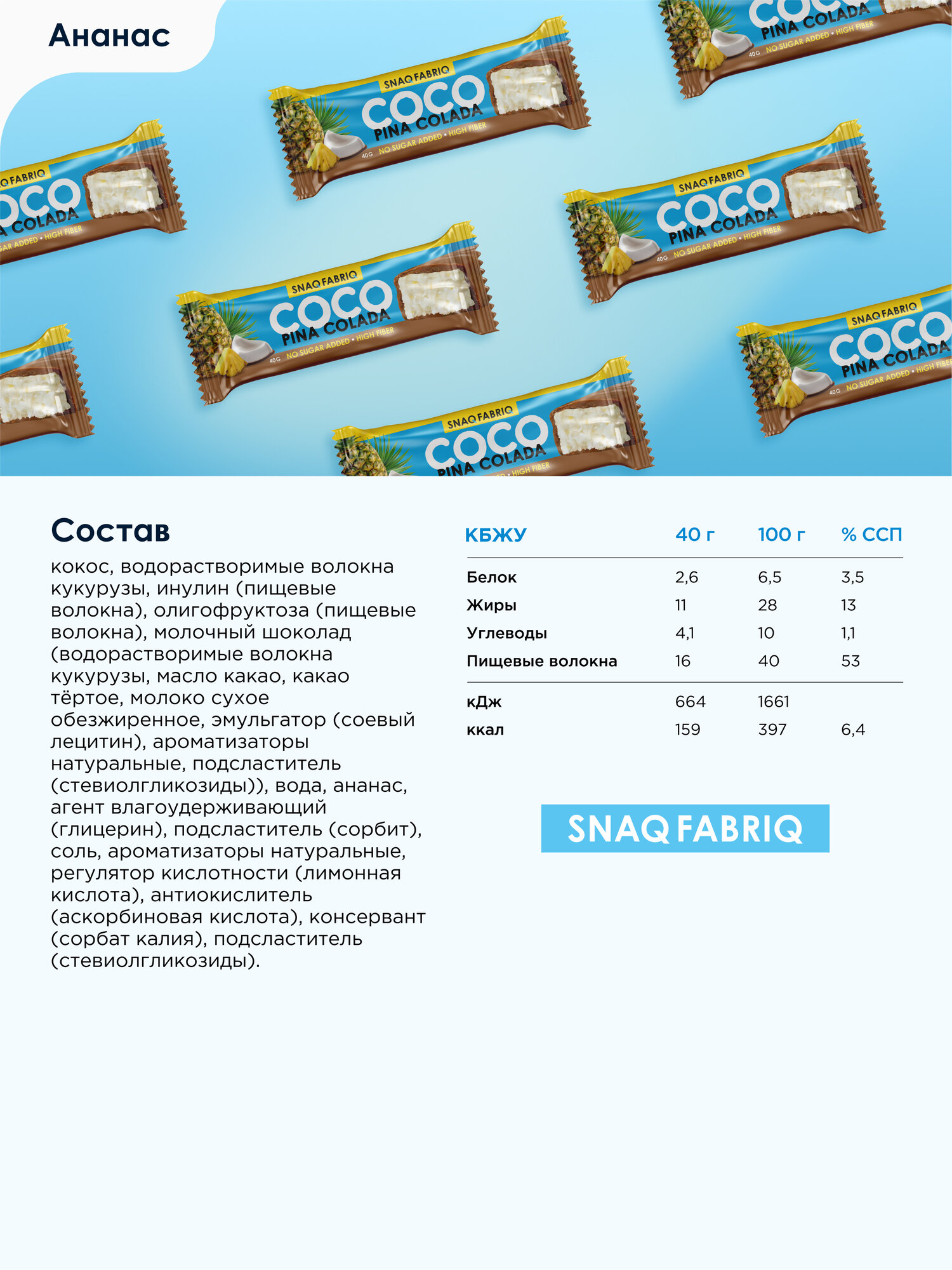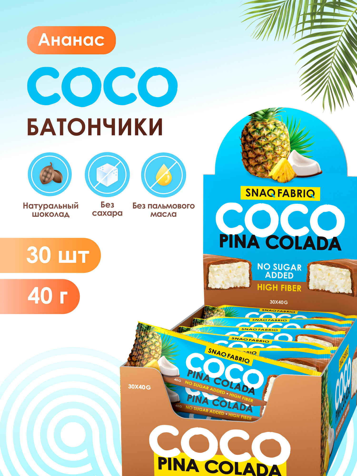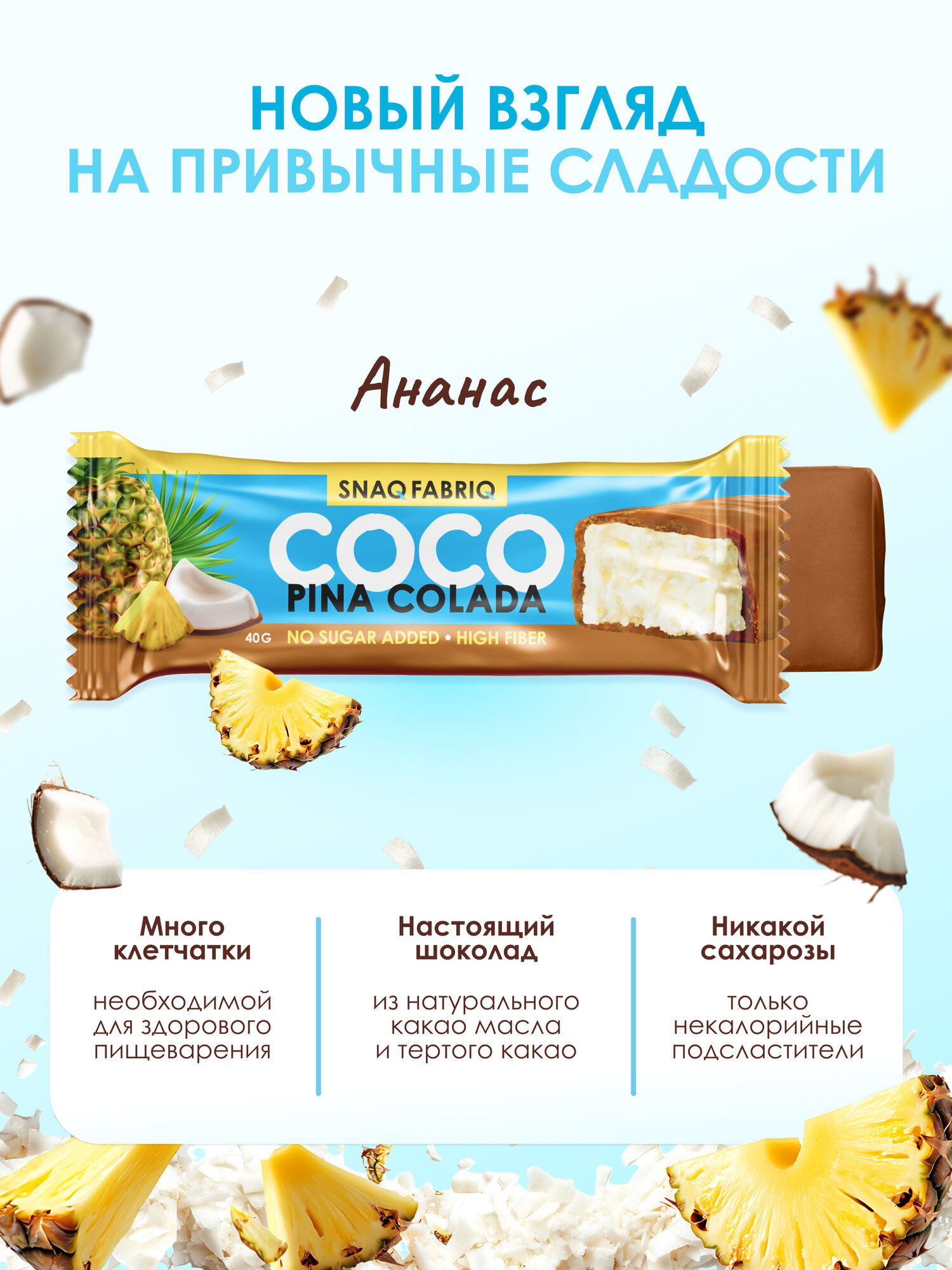 Snaq Fabriq Шоколадные батончики COCO без сахара «Кокос и ананас», 30шт х 40г: сравнение цен, характеристики, фото, актуальное наличие и цены.