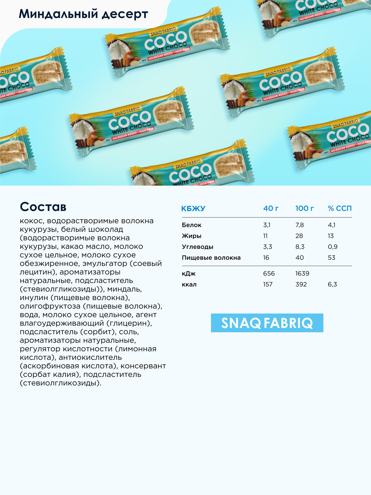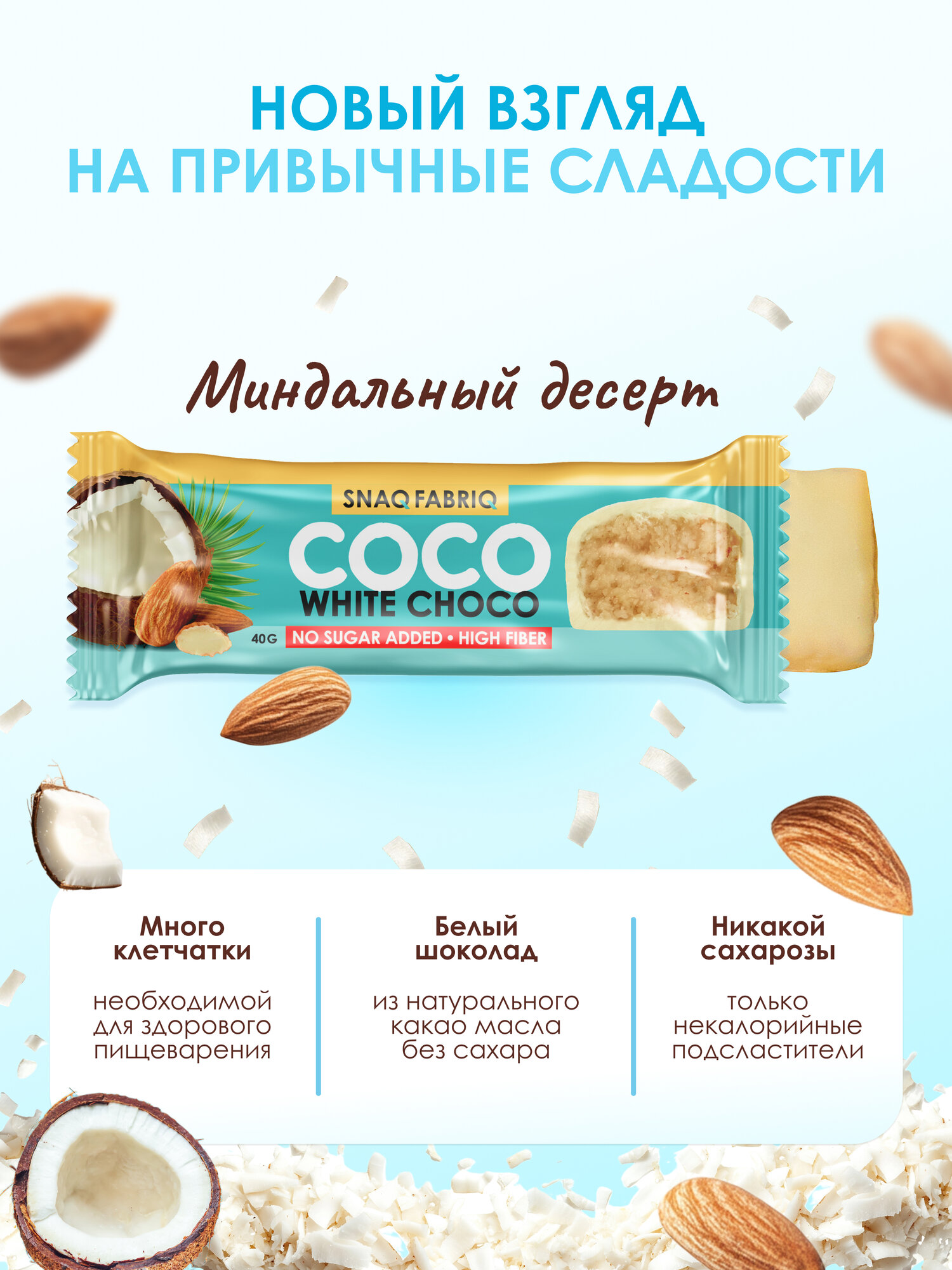 Snaq Fabriq Шоколадные батончики COCO без сахара «Кокос и миндаль», 30шт х 40г: сравнение цен, характеристики, фото, актуальное наличие и цены.