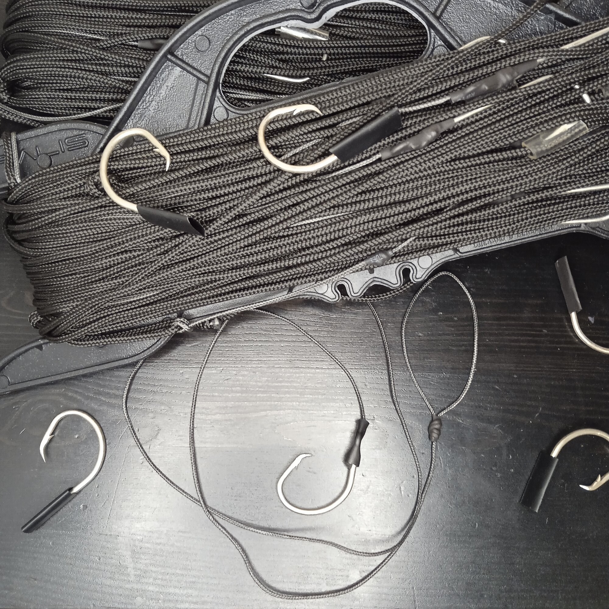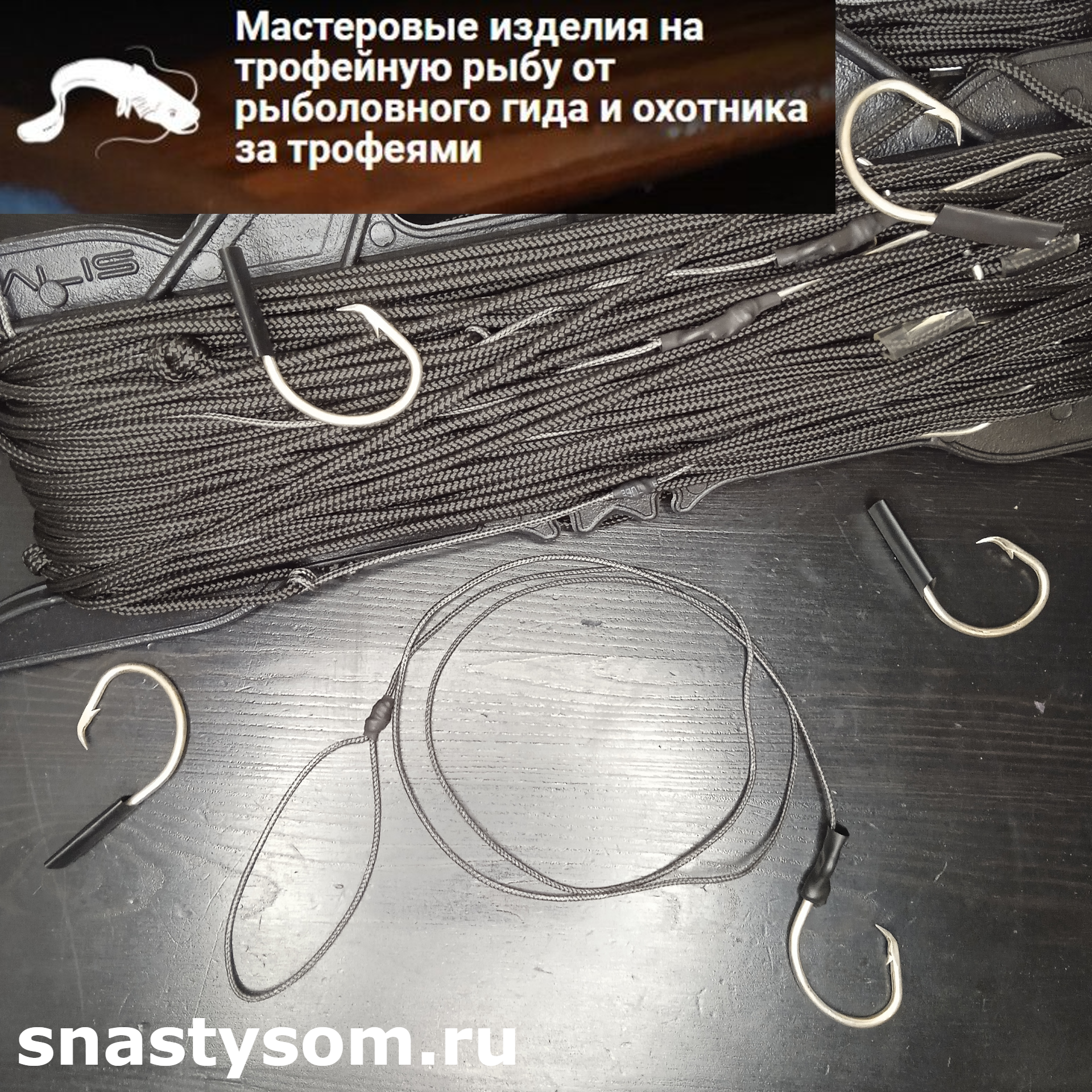 Поводки на сома длинною в 1 метр из износостойкого материала Ф 1.5 мл с разрывной до 100 кг, расстояние от поводка до поводка 4 метра.