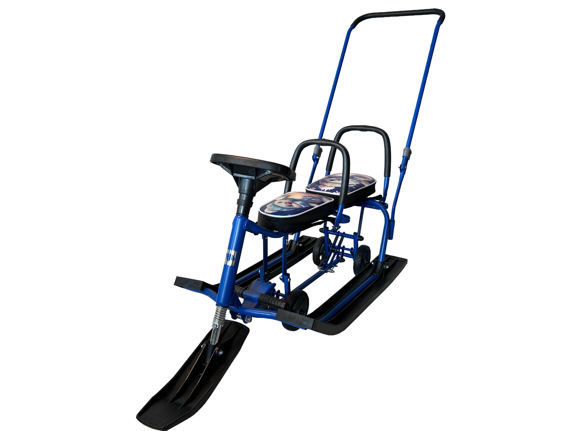 Снегокат детский 507 "TWINS BABY PUSH" С подсветкой имеет два независимых комфортных сиденья, две складных спинки с мягкой оплеткой для защиты спины ребенка, съемную П-образную ручка толкатель с изоляцией из вспененного каучука и выдвижную колесную базу.Спинки имеют эргономичную форму, и не отнимают сантиметры у сиденья снегоката. Благодаря широким сиденьям, каждое из которых оснащено индивидуальным ремнем безопасности-двойня или дети-погодки легко разместятся на снегокате и надежно защищены от падения на поворотах.