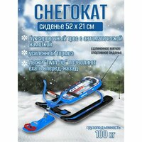 Снегокат предназначен для перевозки детей по плотному снегу или льду, катанию с горок. Имеет сварную конструкцию из стальных труб и пластиковых элементов. Оснащён мягким сиденьем, обтянутым искусственной кожей с рисунком. Оборудован буксировочным тросом с автоматической намоткой и системой амортизации, которая обеспечивает комфортную поездку по крутым горкам и неровным поверхностям. Усиленный тормоз эффективен на обледенелой поверхности.