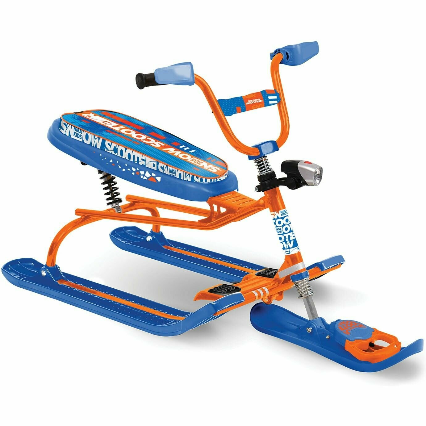 Снегокат предназначен для перевозки детей по плотному снегу или льду, катанию с горок. Имеет сварную конструкцию из стальных труб, пластиковых элементов и мягкое сиденье, обтянутое искусственной кожей с рисунком. Оснащён буксировочным тросом с автоматической намоткой и системой амортизации, которая обеспечивает комфортную поездку по крутым горкам и неровным поверхностям. Усиленный тормоз эффективен на обледенелой поверхности.