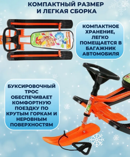 | Особенности | амортизация, буксировочный трос, для взрослых, лыжи твин-тип, мягкое сиденье, ограничитель угла поворота, поворотный руль, складная конструкция, складная спинка, со спинкой, тормоз, трос с автоматическим скручиванием |